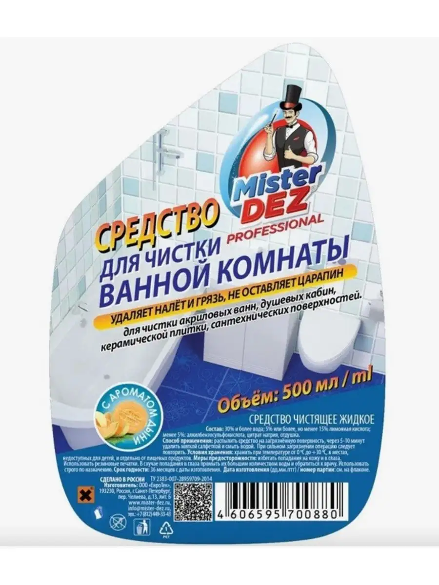 Описание: Средство для очистки ванной комнаты Mister DEZ, 500мл. с ароматом дыни. С распылителем. Предназначено для чистки акриловых ванн, душевых кабин, керамической плитки, сантехнических поверхностей. Удаляет налет и грязь; не оставляет царапин на акриловых поверхностях; обладает приятным ароматом дыни. Товар сертифицирован.