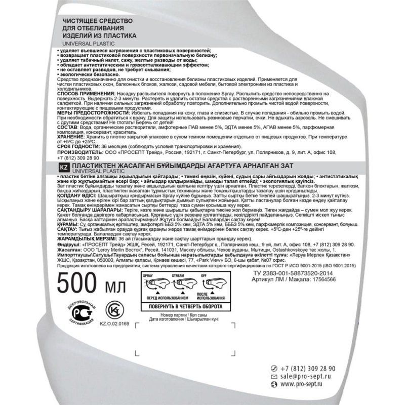 Описание: Средство для отбеливания изделий из пластика Prosept – готовый состав предназначен для очистки пластиковых поверхностей от бытовых и атмосферных загрязнений, а также от клеевого слоя клейкой ленты, наклеек, стикеров и т.д. Применяется для чистки пластиковых окон, балконных блоков, жалюзи, холодильников, садовой мебели, бытовой электроники из пластика.