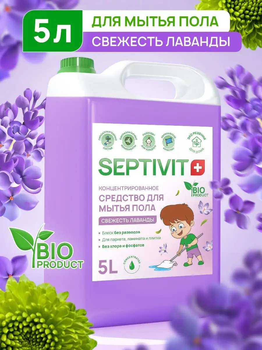 Описание: Средство для мытья пола SEPTIVIT Premium - эффективное средство для мытья полов в большом, семейном объеме 5 литров. Жидкость для мытья пола бережно и эффективно очищает все виды напольных покрытий: ламинат, плитка, паркет. Универсальное средство подходит для влажной ручной уборки, и уборки в моющих пылесосах. Средство не оставляет разводов и не требует смывания. Подходит для домов с домашними животными и детьми, ведь средство биоразлагаемо и состав не содержит агрессивных сульфатов и фосфатов. Тщательно подобранная линейка средств для мытья пола позволит каждому найти “свое” идеальное средство. Переходите в карточку товара и ознакомьтесь с ассортиментом: Bubble Gum, Свежесть Лаванды, Лимонный рай, Устранение запаха от питомцев, с содой, Универсальное, Мандарин. Продукция бренда SEPTIVIT Premium соответствует стандартам ISO 9001:2015, ISO 14001:2015 Septivit Premium - ЭКО-решения для Вашего дома!