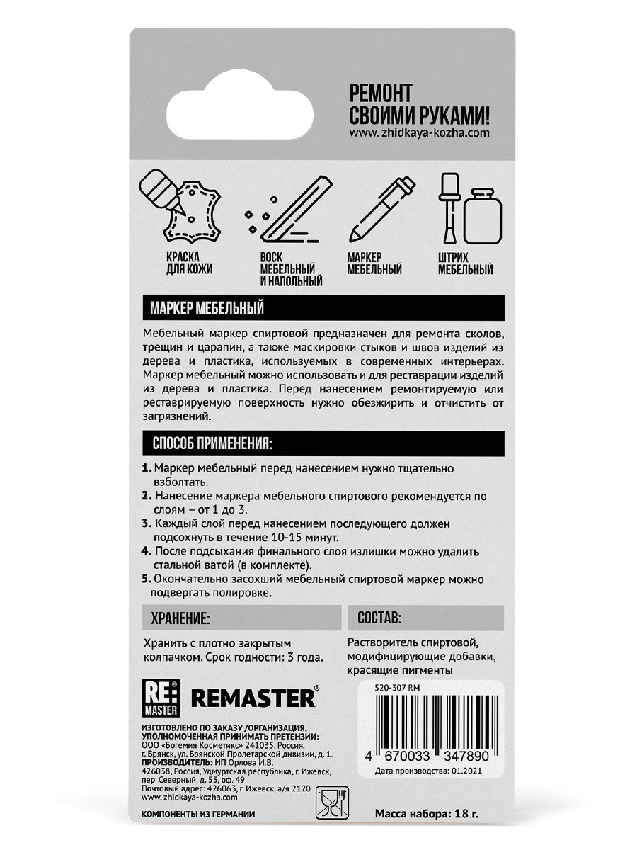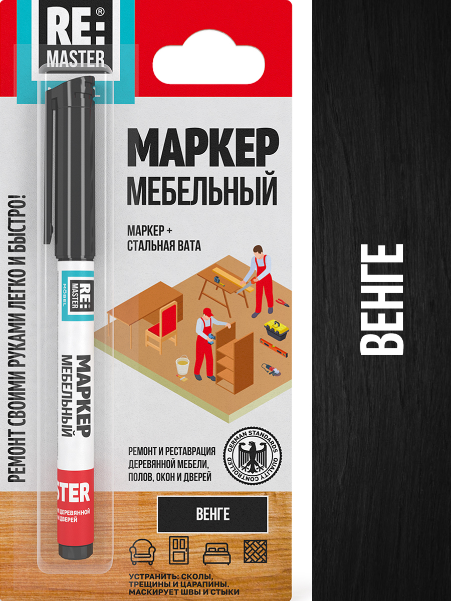 Описание: Средство для ремонта и реставрации поверхности маркер мебельный вентильный спиртовой для ламината, мебели, пола, столешниц, царапин, дерева ReMaster Mobel 3 мл Венге переназначен для ремонта сколов, трещин и царапин, а также маскировки стыков и швов изделий из дерева и пластика, используемых в современных интерьерах. Маркер мебельный можно использовать и для реставрации изделий из дерева и пластика. Перед нанесением ремонтируемую или реставрируемую поверхность нужно обезжирить и отчистить от загрязнений. Средство для ремонта и реставрации поверхности маркер мебельный вентильный спиртовой для реставрации ReMaster Mobel 3 мл Венге перед нанесением нужно тщательно взболтать. Нанесение маркера мебельного спиртового рекомендуется по слоям – от 1 до 3. Каждый слой перед нанесением последующего должен подсохнуть в течение 10-15 минут. После подсыхания финального слоя излишки можно удалить мягкой влажной тканью. Окончательно засохший мебельный спиртовой маркер можно подвергать полировке. Удаляет сколы, трещины и царапины. Маскирует швы и стыки.