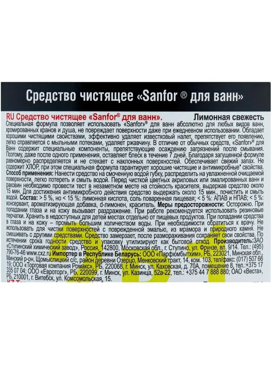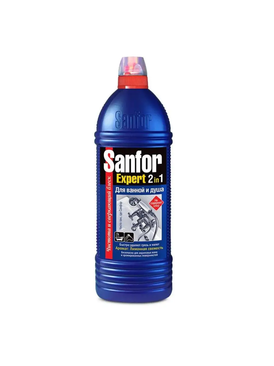 Описание: Средство для сантехники Sanfor Expert 2 в 1 750 мл. Назначение. Густой гель Expert 2 в 1 предназначен для ухода за ваннами, душевыми кабинами, джакузи. Эффективная формула легко удаляет известковый налет, мыльные потеки и другие загрязнения. Безопасно для акриловых поверхностей и хромированных кранов. Обеспечивает длительную чистоту и сияющий блеск. Не содержит хлор. Благодаря загущенной формуле равномерно распределяется по поверхности, экономично расходуется. Флакон оснащен антискользящей поверхностью, его удобно удерживать в руке во время уборки, а также блокиратором крышки для защиты от детей. Оставляет после уборки аромат лимонной свежести. Способ применения. Нанести средство на смоченную водой губку, распределить на увлажненной очищаемой поверхности, легко потереть и смыть водой. Перед чисткой цветных акриловых или эмалированных ванн и раковин необходимо провести тест в незаметном месте на стойкость красителя, выдержав средство около 15 мин. Для достижения антимикробного действия средство выдержать около 15 мин., почистить и смыть водой. Меры предосторожности. Осторожно. При попадании в глаза и на кожу вызывает раздражение. При попадании на кожу промыть большим количеством воды. При попадании в глаза осторожно промыть водой в течении нескольких минут. При необходимости обратиться за медицинской помощью. При работе рекомендуется использовать щетку или резиновые перчатки. Перед применением рекомендуется опробовать средство на небольшом незаметном участке. Не использовать для чистки поверхностей из нержавеющей стали, акриловых ванн, окрашенных и других чувствительных к средству поверхностей. Состав. > 5%, но < 15%: лимонная кислота; < 5%: АПАВ и НПАВ; < 5%: консервант, ароматизирующая добавка, d-лимонен, краситель. Условия хранения. Хранить в недоступном для детей месте. Не смешивать с другими веществами. Хранит плотно закрытым в прохладном месте, отдельно от пищевых продуктов. Средство замерзает, после размораживания сохраняет свои свойства. По истечении срока годности средство и упаковку утилизируют как бытовой отход. Срок годности. 24 месяца.