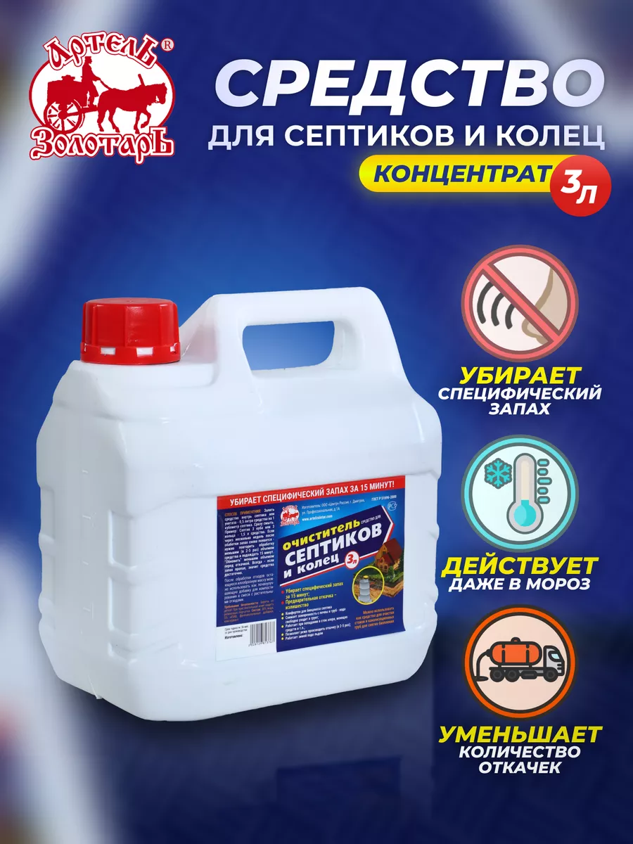 Описание: Средство для септиков и колец, выгребных ям, дачных туалетов, биоактиватор для бактерий "Артель Золотарь" убирает специфический запах за 15 минут, снимает "зажиренность" с почвы и труб - вода свободно уходит в грунт; в отличие от бактерий - идеально работает при попадании в сток хлора, моющих средств и т.п.; позволяет реже производить откачку (в 2 - 5 раз); работает зимой подо льдом. Способ применения: залить Средство внутрь септика или унитаза - 0,5 л Средства на 1 кубометр септика или 1 кольцо. Сразу смыть. Убирает специфический запах за 15 минут.Пример: Септик 3 куба или 3 кольца - 1,5 л Средства. Если через несколько недель (4 - 6 недель, как правило, не менее) после обработки запах снова начнет появляться - нужно повторить обработку меньшим (в 2 - 5 раз) объемом Средства и подождать 15 минут. Можно "обновить" меньшим объемом (0,2 - 0,5 л) перед откачкой. Всегда - запах пропал, Средства "Артель Золотарь" - достаточно.За 2 недели реанимирует дренаж, "съедает" анаэробный налет ("зажиренность") со дна септика. "Вода" уходит. Откачка нужна реже.