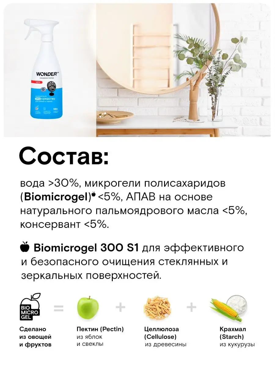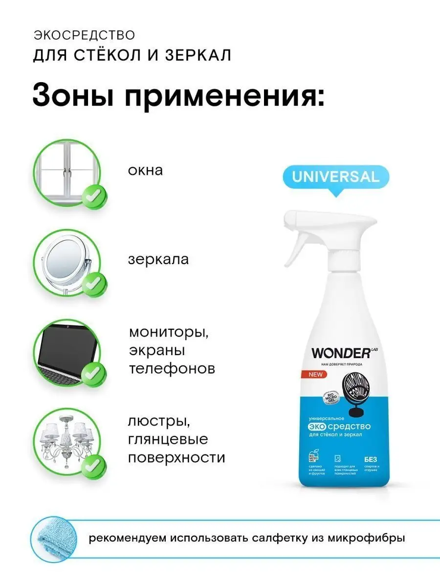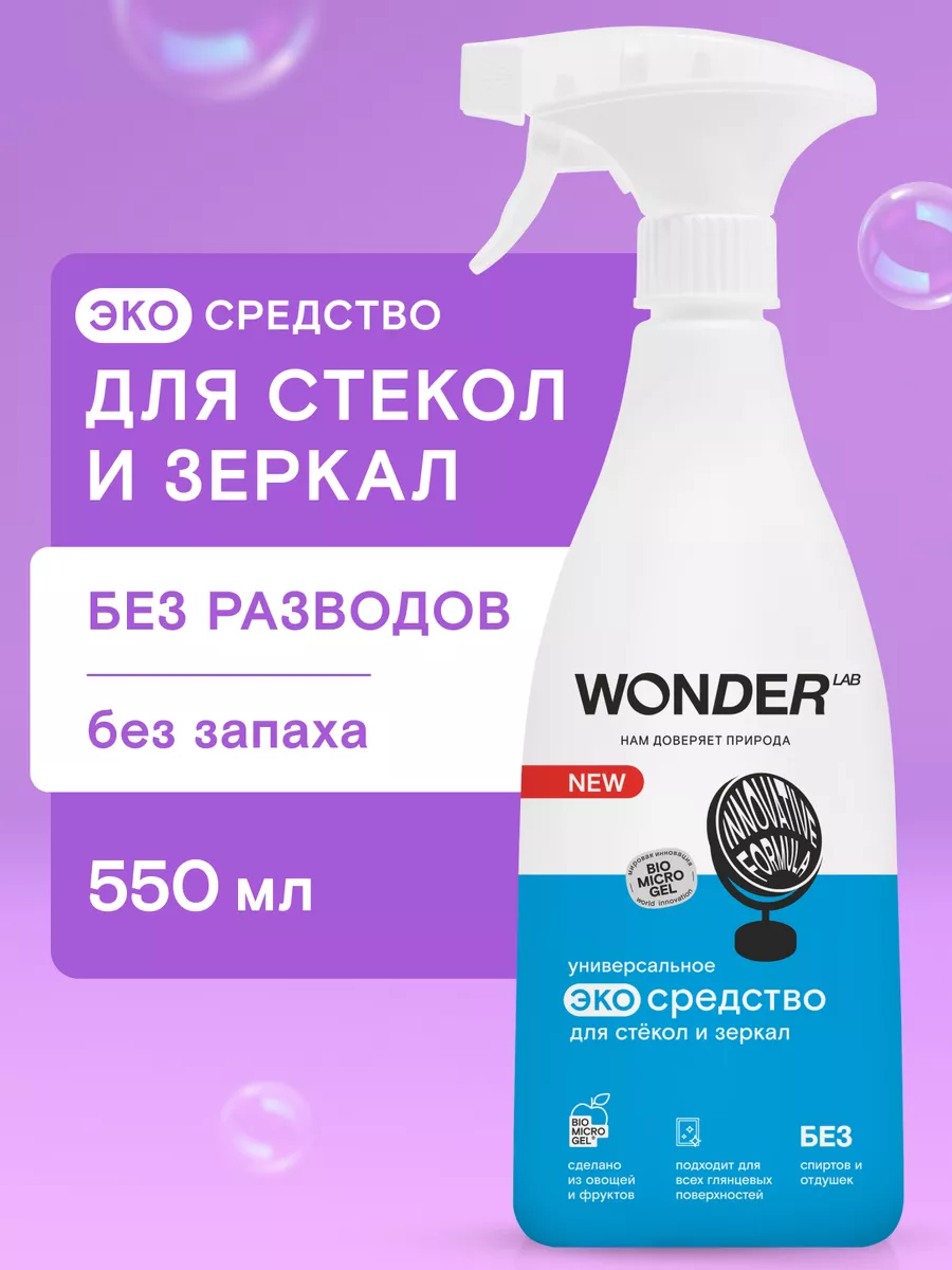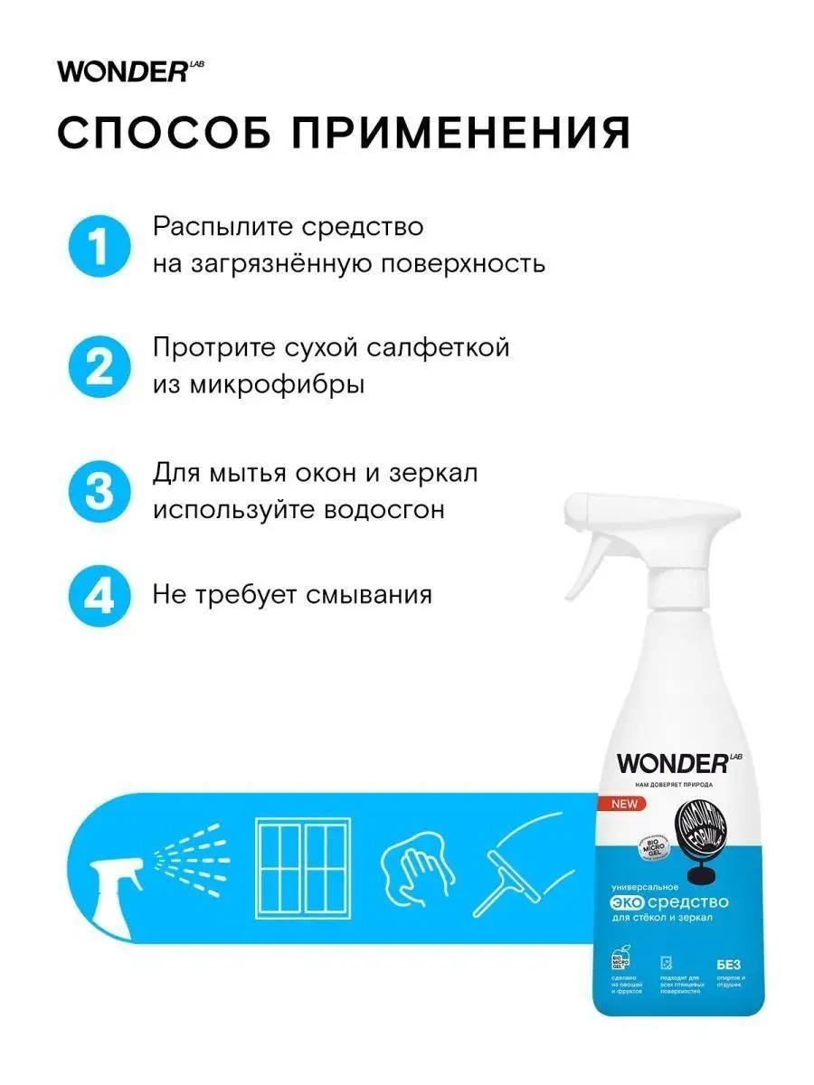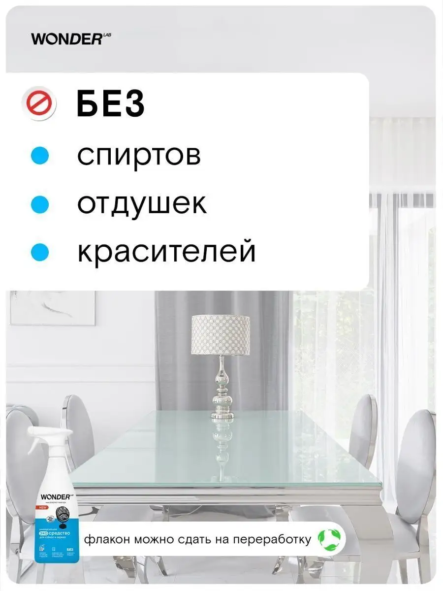 Описание: Средство для мытья стекол зеркал Wonder Lab БЕЗ СПИРТА - 550 мл. Моющее средство - разработано для ежедневного ухода за окнами, зеркалами, пластиком, мониторами, ноутбуками, телевизорами, экраны телефонов, глянцевыми поверхностями и люстрами. Благодаря инновационной формуле, универсальное средство для зеркал не оставляет плёнок, царапин и разводов. Чистящее средство для мытья окон и зеркал не содержит отдушек. Формула средства для уборки дома безопасна для всех членов семьи и окружающей среды. Эко спрей для мониторов с инновационной формулой не нарушает экосистему водоемов, так как не содержит агрессивных компонентов. Способ применения: распылите жидкость на загрязненную поверхность стекла, протрите сухой салфеткой из микрофибры. Для мытья окон и зеркал используйте водосгон. Не требует смывания. Не поддерживаем тестирование на животных. Мы называем наши продукты экологичными, потому что основа Biomicrogel, который разлагается на 98 процентов за 24 часа. Средства мы делаем из овощей и фруктов. Средство без спиртов, фосфатов и фосфонатов. Вы можете ознакомиться с каталогом бытовой химии для дома Wonder lab - нажав на логотип бренда справа.