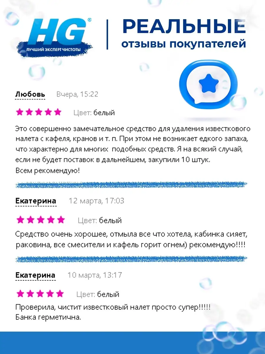 Описание: Эффективное средство легко устраняет известковые отложения с поверхности кафеля, раковин, душевых кабин, раковин из нержавеющей стали. Бережно и без особых усилий помогает содержать дом в чистоте и порядке. Европейское качество, товары для уборки произведены в Нидерландах. Бытовая химия для дома HG . Чистящее средство для уборки ванной комнаты от известкового налёта ржавчины в ванной и туалете. Бытовая химия HG используется для очистки и отбеливания, устранения налета в душевых кабинах. Моющие средства подходят для кухни и для пола, сантехники, фаянсовых изделий и кафеля. Товары для уборки для удаления известкового налета, мыльных разводов и солевых отложений. Эффективная формула универсального чистящего состава быстро удаляет застарелые загрязнения. Специальные компоненты очистителя создают защитную пленку на поверхности. Моющее средство создает чистоту и блеск, сохраняя эффект на несколько дней. Средство для мытья унитаза способствует устранению неприятного запаха, убивает микробы. Спрей для уборки обеспечивает экономичный расход. Чистящее средство для кухни и ванны эффективно удаляет известковый налёт, ржавчину любой сложности. Средства для уборки убирают накипь, мыльные разводы, камень и въевшуюся грязь с любых стальных, алюминиевых и стеклянных поверхностей.