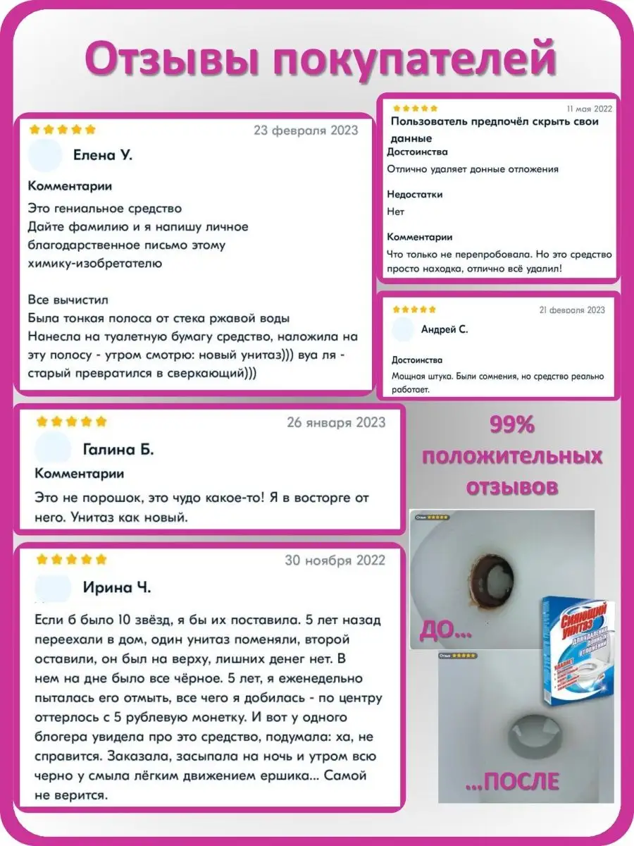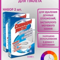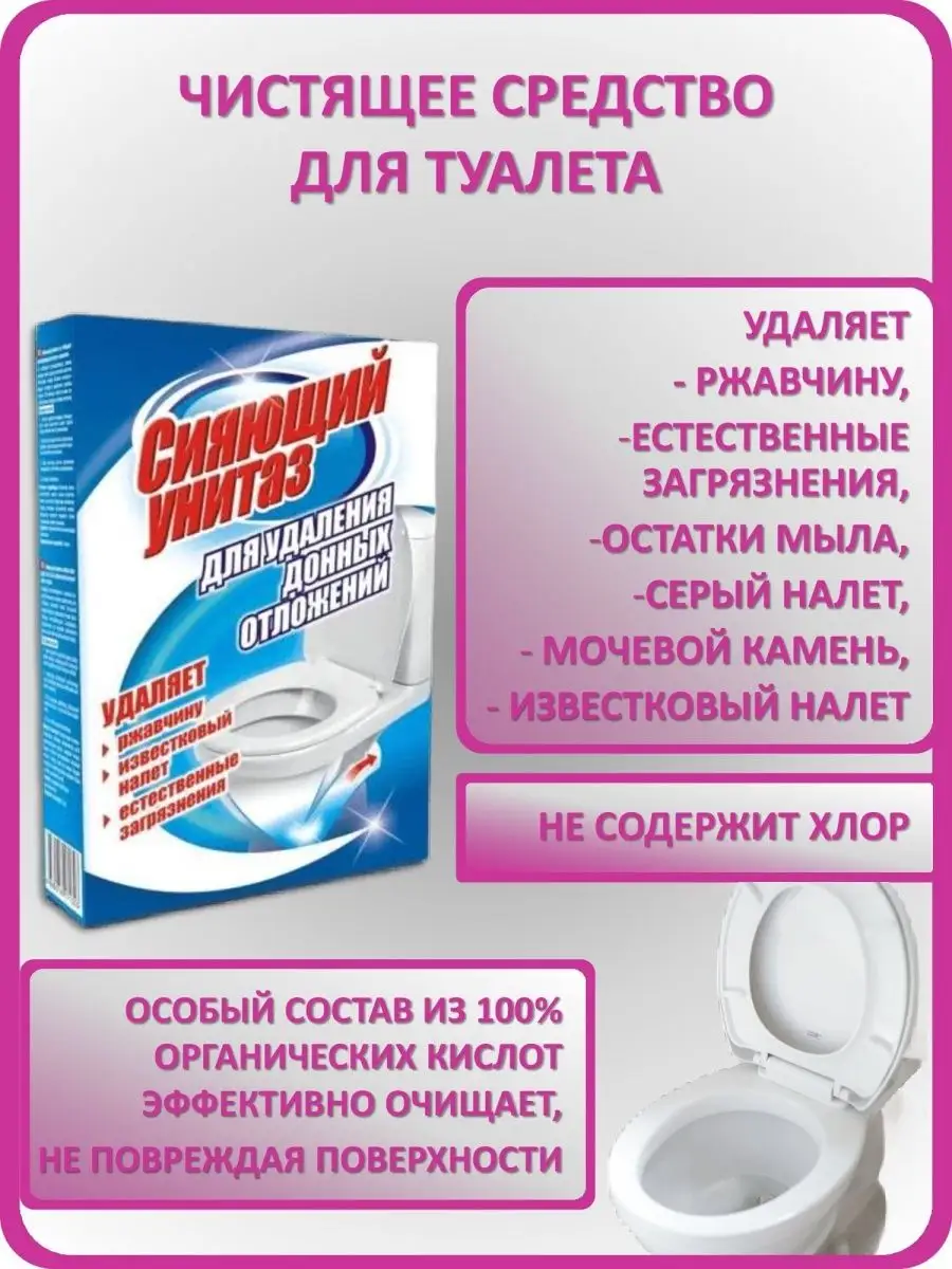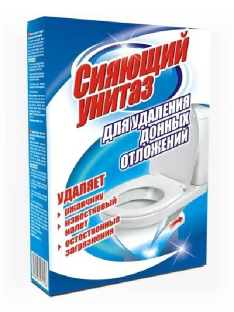 Описание: Сияющий унитаз - чистящее средство для туалета, очиститель унитаза. Данная бытовая химия эффективно очищает загрязнения в данной части унитаза. Используется как средство для чистки унитаза для удаления донных отложений, в том числе застарелых, которые образовываются в подводной части унитаза. Средство для унитаза эффективно удаляет: РЖАВЧИНУ, ЕСТЕСТВЕННЫЕ ЗАГРЯЗНЕНИЯ, ИЗВЕСТКОВЫЙ НАЛЕТ МОЧЕВОЙ КАМЕНЬ, ОСТАТКИ МЫЛА, СЕРЫЙ НАЛЕТ. Средство от извести и ржавчины обладает дезинфицирующим свойством. Чистящее средство также убивает вредные бактерии. Можно использовать также для чистки раковин, ванн для удаления известкового налета (антиналет). Средство для чистки туалета устраняет неприятный запах и продлевает срок эксплуатации сантехники. Средство для сантехники не повреждает поверхность унитаза, в отличие от скребков и пемзы, эффективно очищает, придает блеск и свежесть. Прост в применении. Способ применения: перекрыть доступ воды к унитазу, чтобы предотвратить "бегущую струю", засыпать средство для туалета в объеме одной коробки в подводную часть унитаза. Оставить для воздействия на 1 час, при сильном загрязнении возможно оставить на всю ночь. Смыть водой. При сильном загрязнении возможна дополнительная обработка.
