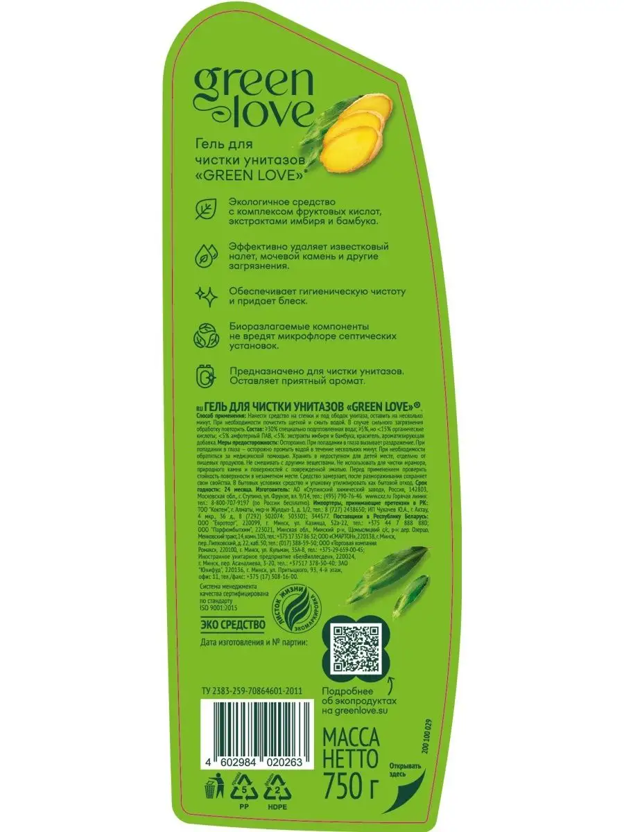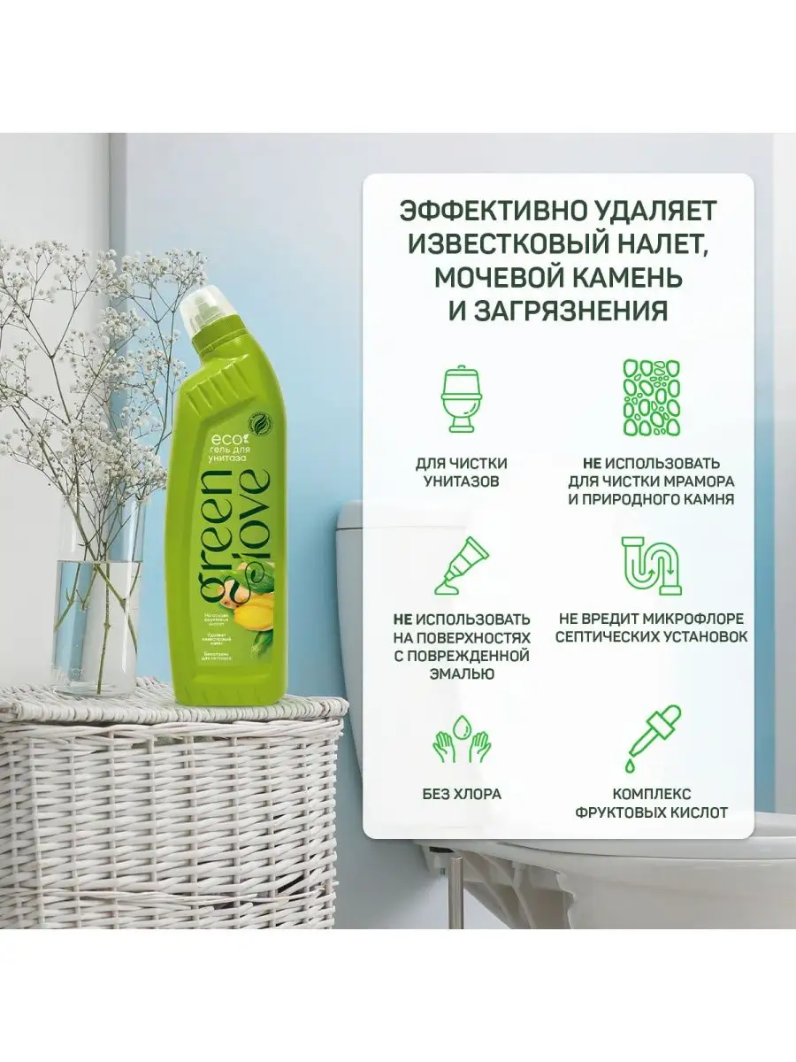 Описание: Чистящее средство для унитаза "Green love" - это экологичное и эффективное решение для уборки вашего унитаза. С его помощью вы легко избавитесь от известкового налета, мочевого камня и других загрязнений на поверхности. Гель для чистки изготовлен на основе фруктовых кислот с экстрактами имбиря и бамбука, не вредит сантехнике и микрофлоре септических установок, полностью безопасен для людей и животных в доме. Не подходит для мытья мрамора, природного камня и поверхностей с поврежденной эмалью. Экосредство нейтрализует неприятный запах и имеет нежный легкий аромат зеленого бамбука. Его уникальная формула обеспечивает длительный эффект чистоты и свежести, сохраняя унитаз чистым надолго. Очиститель Green love безопасен в использовании и имеет экологичный состав, подтвержденный сертификатом «Листок жизни». Он не содержит агрессивных кислот и химических веществ, что делает его безопасным для вас и окружающей среды. Без хлора, парабенов, фосфатов, SLS и химических красителей. Биоразлагаемые компоненты. Универсальный WC экогель Green love - это идеальное решение для всех, кто ценит чистоту, свежесть и эффективность в уборке унитаза. Он придает вашему туалету блеск, чистоту и приятный аромат, безопасно удаляя грязь и солевые отложения. Попробуйте моющее средство Green love и ощутите его мощный очищающий эффект.