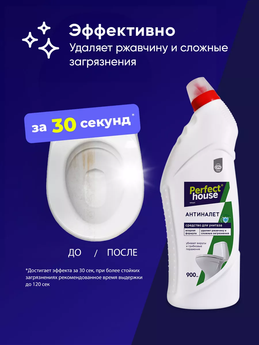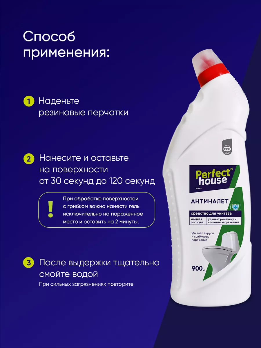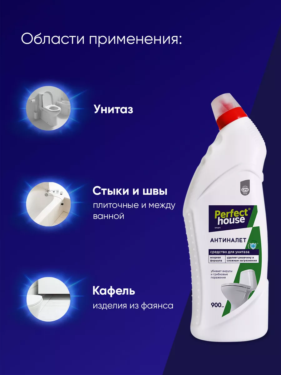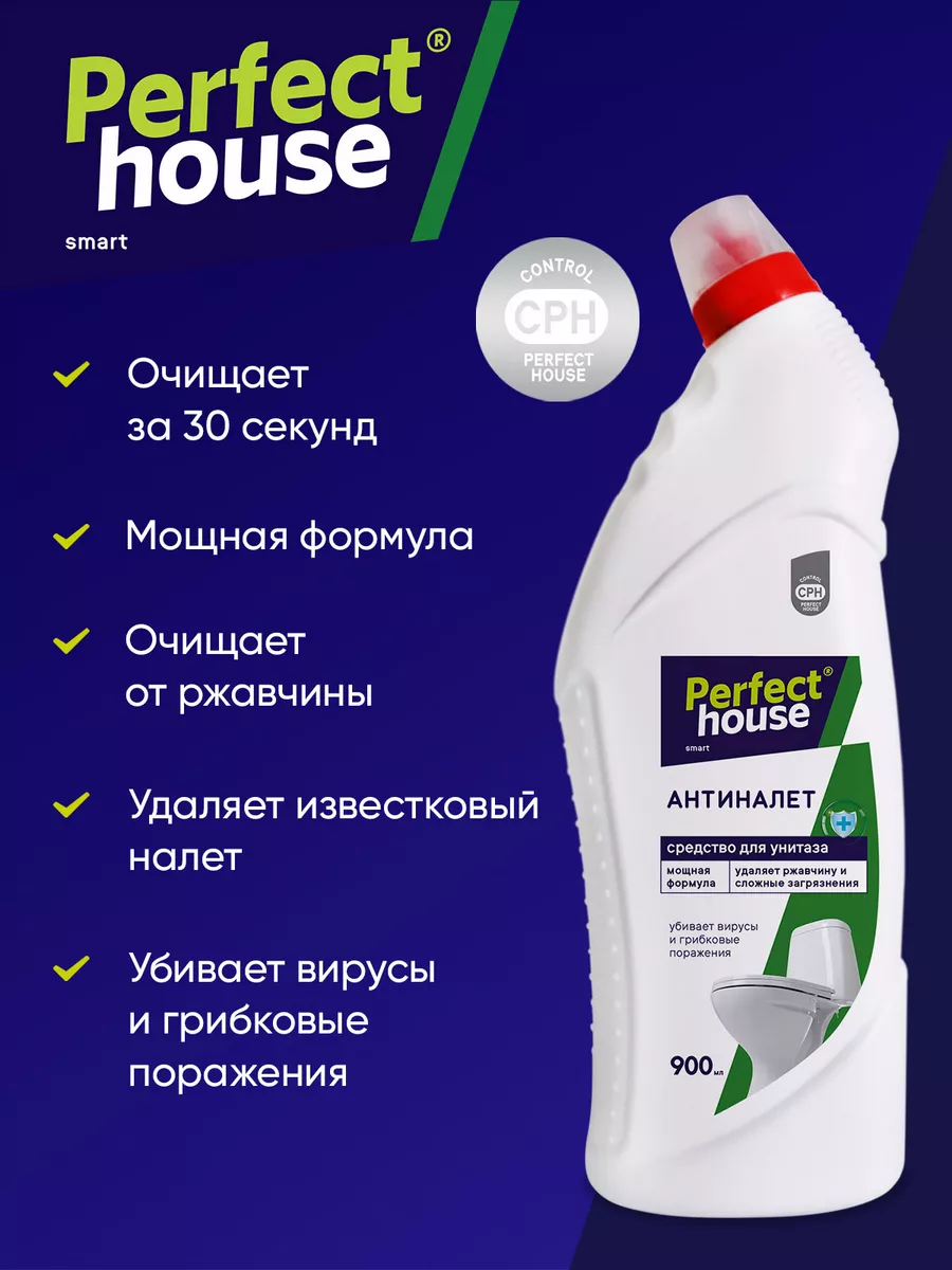 Описание: Чистящий гель для унитаза Антиналет от Perfect House 900 мл - это средство, специально разработанное для очистки и дезинфекции туалетов и других поверхностей в ванной комнате. Активная формула обеспечивает гигиеническую чистоту, предотвращает образование застарелого известкового налета, ржавчины и солевых отложений всего за 30 секунд. Он помогает предотвратить повторное загрязнение, придает туалетной комнате свежий аромат. Универсальное средство для туалета с антибактериальным эффектом способствует устранению неприятного запаха, убивает микробы, грибковые поражения и 99% вирусов. Моющее средство для унитаза равномерно распределяется по обрабатываемой поверхности и охватывает труднодоступные участки, места скопления бактерий под ободком унитаза. Благодаря густой консистенции геля и формы флакона, он равномерно распределяется, покрывая всю поверхность, не стекает, экономично расходуется и сохраняет эффективность даже под водой. Средство для чистки можно использовать и в других областях, таких как стыки и швы плиточных поверхностей, между ванной и кафелем, а также для очистки изделий из фаянса. Отсутствие хлора в составе жидкости делает его гораздо безопаснее для использования в домашних условиях. Хлор содержит агрессивные химические вещества, которые могут вызывать раздражение кожи и дыхательных путей. Также в очистителе для туалета нет абразивов, поэтому он обладает более мягким воздействием на поверхность и помогает избежать их повреждений. Продукт подходит для частого применения профилактики и защиты от загрязнений. Способ применения: наденьте резиновые перчатки и нанесите средство для мытья на очищаемую поверхность до 2 минут, после выдержки тщательно смойте водой. Чистящее средство для унитаза от Pefect House поможет сократить время уборки, а также продлит срок службы обрабатываемых покрытий за счет мощной формулы.