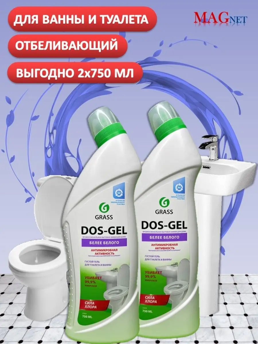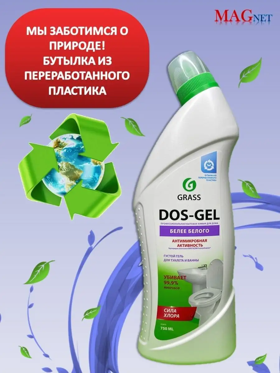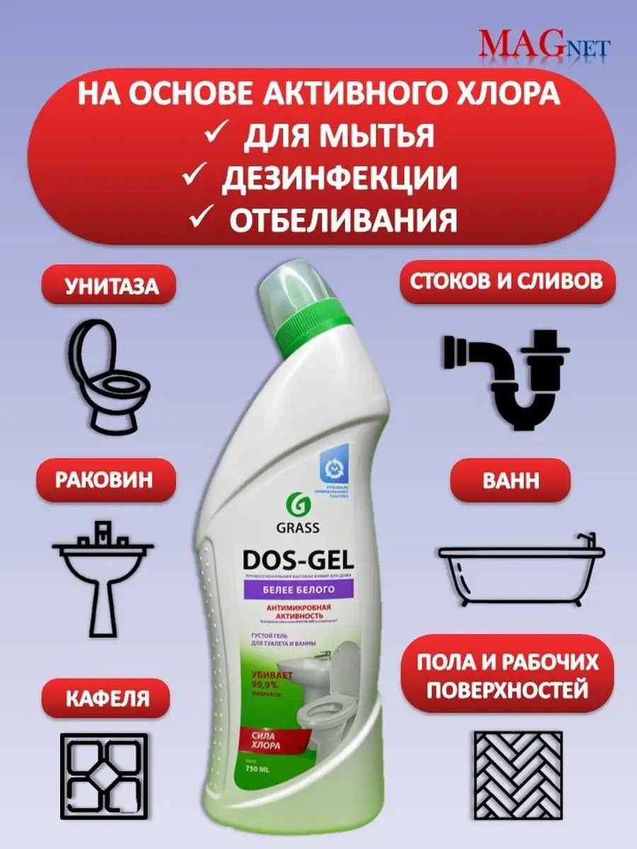 Описание: Гель для чистки унитаза Dos gel против налета Grass Грасс - это профессиональная бытовая химия для ванной, кухни, туалета, фаянсовых изделий. Чистящее средство для ванной и туалета - универсальное средство для уборки, подходящее для ежедневной уборки всех видов поверхностей в ванных комнатах и санузлах (гель для уборки, очиститель для унитаза). Моющее средство ДОС гель идеально подходит для чистки фаянсовых изделий на кухне и ванной комнаты, туалетов, акриловых ванн, раковин, кафеля, стоков, сливов, пола и рабочих поверхностей. Обладает дезинфицирующими свойствами, удаляет плесень и грибок. Пары защищают от микробов. Подходит для профилактики засоров и устранения неприятных запахов из сточных труб. Густая формула позволяет средству дольше оставаться на стенках, продолжая работать и обеспечивает его экономичный расход. Бытовая химия от Грасс - это эффективные средства для уборки вашего дома. Способ применения: для унитаза: нанести под ободок и оставить на несколько минут, потереть ершиком, смыть водой. Для ванной и раковины: нанести на поверхность, потереть щеткой или губкой, оставить на несколько минут, смыть водой. Для мытья пола и рабочих поверхностей: разбавить из расчета 60 мл на 5 л воды. Отбеливание белья, белизна: развести из расчета 15 мл на 5 л теплой воды, замочить белье в растворе и оставить на 45 минут, после чего тщательно прополоскать. Для унитаза средство удаляет налет, чистит и дезинфицирует под ободком унитаза. Чистящие средства для унитаза способствуют устранению неприятного запаха из туалета, убивает 99 % микробов. Средство для унитазов для раковины придает поверхности чистоту и блеск, сохраняя белоснежный эффект и антиналет на несколько дней. Dos-gel Grass для унитаза является незаменимым дезинфицирующим и антибактериальным средством для удобной и быстрой уборки дома.