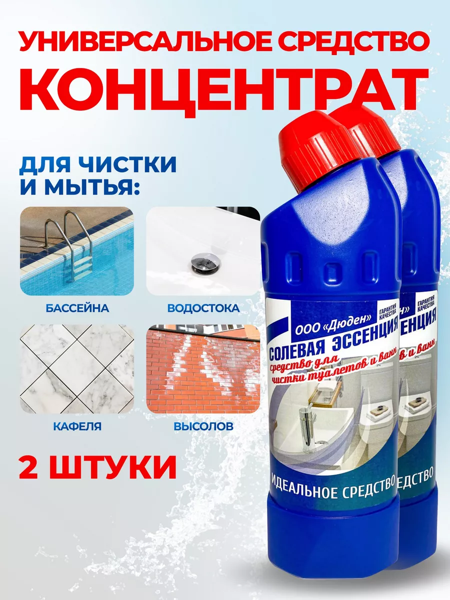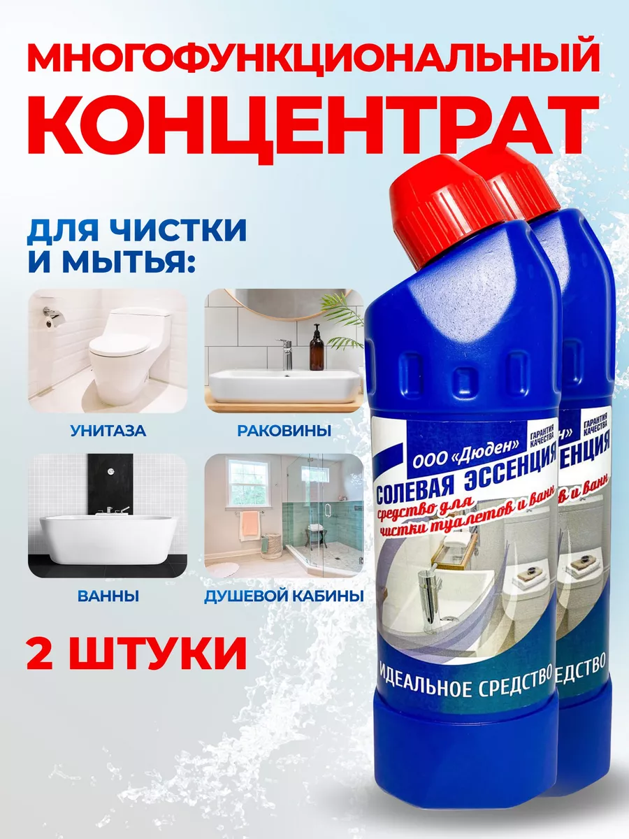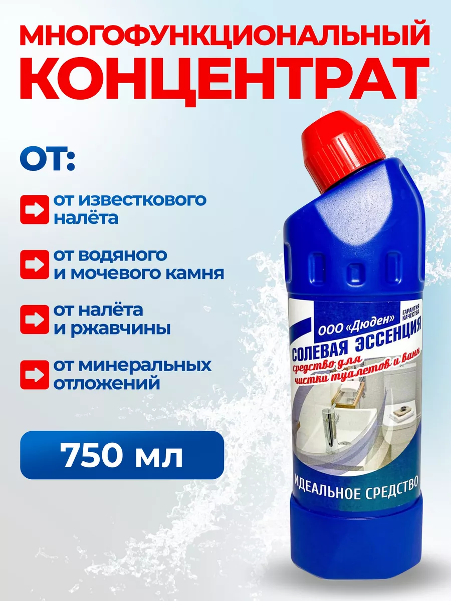 Описание: Чистящее средство Концентрат Солевая эссенция Дюден 7в1. Самая действенная бытовая химия среди для ванны и унитаза. Средство для сантехники подходит для удаления запаха в туалете и ванной от налета и мочевого камня, который скапливается под ободком унитаза, биде, писсуара и трапов для дома. Очиститель чаши биотуалета удалит наросты известкового камня и минеральные отложения с пластика. Особенность многофункционального концентрата это дезинфекция от бактерий и микробов, т.к. средство содержит неорганические и органические кислоты. Подходит для мытья кафельного пола в душевой кабине от известкового и мыльного налета. Отчистит плитку от известкового налета и ржавчины, используется клинерами для уборки после ремонта. Удаляет цемент с кафеля и плиточные смеси. Также удалит минеральные отложения в трубах после удаления засора и жировых пробок при чистки труб. Очистит без следа потеки ржавчины, мыльный осадок, мочевой камень, жир и глубоко въевшуюся грязь, отмоет застарелые солевые и известковые отложения. Не понадобится очищающий блок для унитаза, достаточно залить 50гр Солевой эссенции в бачок с водой, оставить на несколько минут и смыть. Эффекта хватит надолго. Возможно купить набором по 2, 6 штук. Способ использования указан на упаковке. Соляную кислоту разводить в пропорции 1 часть средства от 10 до 20 частей воды в зависимости от загрязнения. Иногда используют концентрат. Достаточно протереть известковый налет веществом, и он тут же растворяется. Внимательно прочтите инструкцию! Использовать ее необходимо предельно осторожно, защищая не только кожу, но и дыхательные пути. ВНИМАНИЕ! Солевая эссенция содержит кислоту! При попадании на кожу немедленно промыть чистой водой! Ни в коем случае не вдыхать! Не использовать для стирки тканей! Использовать плотные резиновые ПЕРЧАТКИ! Хранить в недоступном для детей месте! Не вдыхать пары!