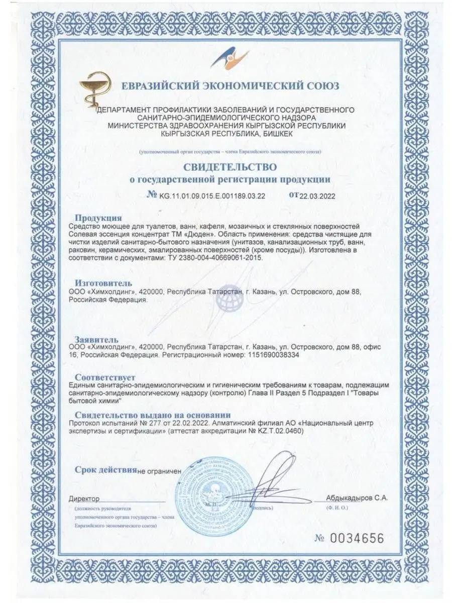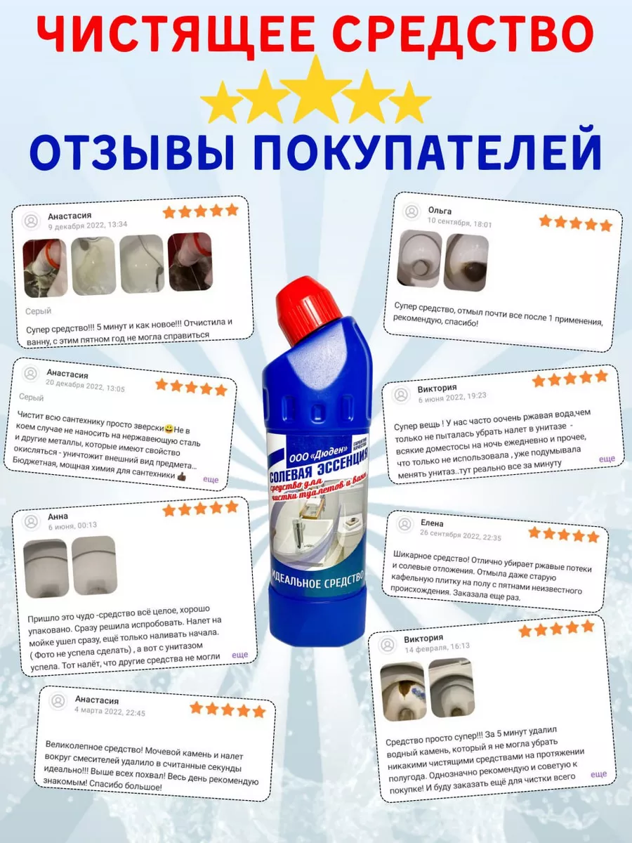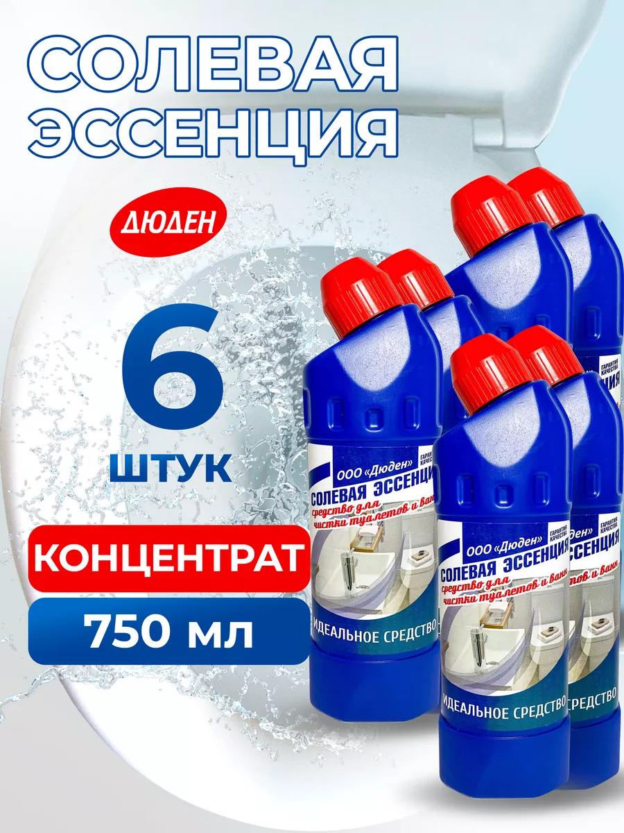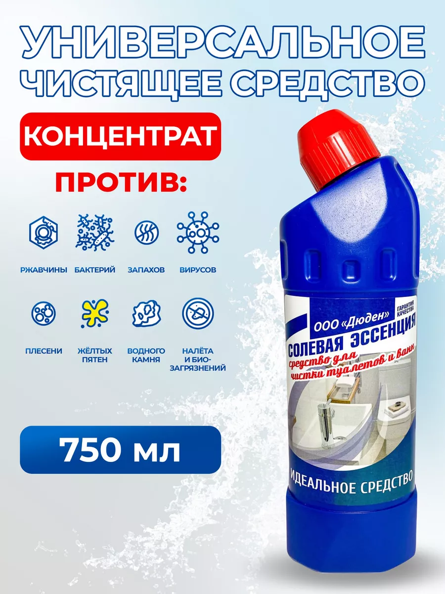 Описание: Чистящее средство Концентрат Солевая эссенция Дюден 7в1. Самая действенная бытовая химия среди для ванны и унитаза. Средство для сантехники подходит для удаления запаха в туалете и ванной от налета и мочевого камня, который скапливается под ободком унитаза, биде, писсуара и трапов для дома. Очиститель чаши биотуалета удалит наросты известкового камня и минеральные отложения с пластика. Особенность многофункционального концентрата это дезинфекция от бактерий и микробов, т.к. средство содержит неорганические и органические кислоты. Подходит для мытья кафельного пола в душевой кабине от известкового и мыльного налета. Отчистит плитку от известкового налета и ржавчины, используется клинерами для уборки после ремонта. Удаляет цемент с кафеля и плиточные смеси. Также удалит минеральные отложения в трубах после удаления засора и жировых пробок при чистки труб. Очистит без следа потеки ржавчины, мыльный осадок, мочевой камень, жир и глубоко въевшуюся грязь, отмоет застарелые солевые и известковые отложения. Не понадобится очищающий блок для унитаза, достаточно залить 50гр Солевой эссенции в бачок с водой, оставить на несколько минут и смыть. Эффекта хватит надолго. Возможно купить набором по 2, 6 штук. Способ использования указан на упаковке. Соляную кислоту разводить в пропорции 1 часть средства от 10 до 20 частей воды в зависимости от загрязнения. Иногда используют концентрат. Достаточно протереть известковый налет веществом, и он тут же растворяется. Внимательно прочтите инструкцию! Использовать ее необходимо предельно осторожно, защищая не только кожу, но и дыхательные пути. ВНИМАНИЕ! Солевая эссенция содержит кислоту! При попадании на кожу немедленно промыть чистой водой! Ни в коем случае не вдыхать! Не использовать для стирки тканей! Использовать плотные резиновые ПЕРЧАТКИ! Хранить в недоступном для детей месте! Не вдыхать пары!