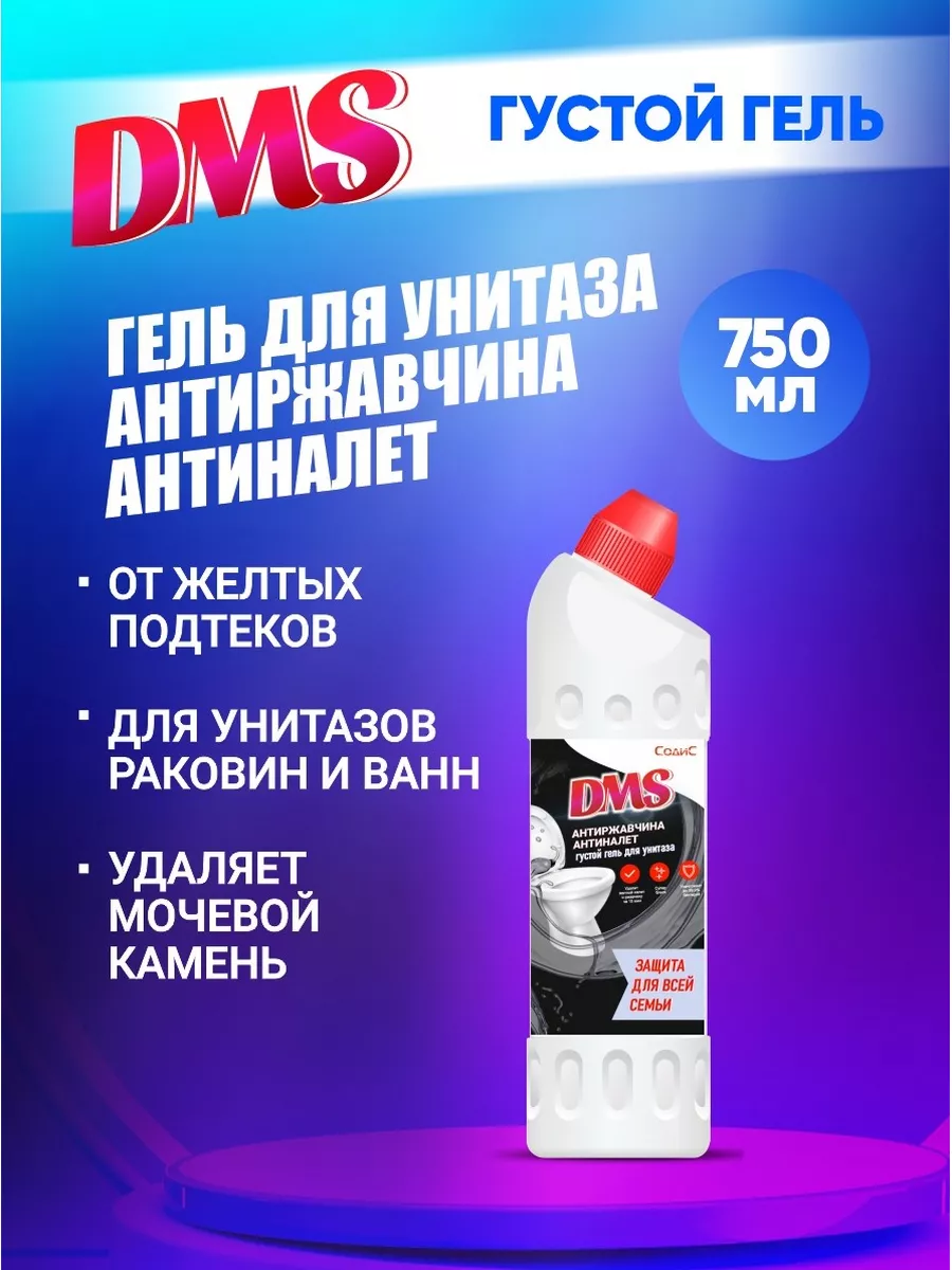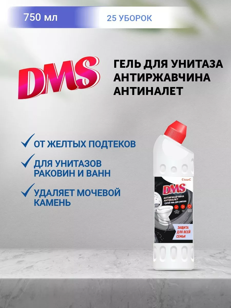 Описание: Средство для унитаза от ржавчины DMS Антиржавчина - эффективное средство от ржавчины для туалета и очиститель сантехники производства Казанского завода «Содис». Универсальный очиститель анти ржавчина эффективно удаляет ржавчину и известковый налёт, возвращая поверхности чистоту, блеск и сияние (антиналет). Чистящее средство для унитаза максимально и тщательно очищает грязь, водный и мочевой камень, удаляет до 100% застарелой ржавчины и известкового налёта. Чистящее средство для ванны поможет в уборке сантехники, можно использовать как средство для акриловых ванн. Гель для унитаза от ржавчины 5 литров - средство от известкового налета, идеальное средство для борьбы с минеральными и солевыми отложениями, въевшейся грязью в: душевая кабина, кафель в ванной, биде, дачный туалет, писсуар детский, детский горшок, ободок на унитазе, сантехника для ванной. Гель для уборки в ванной комнате и в туалете имеет густую формулу, благодаря чему хорошо удерживает средство для туалета на любой поверхности, даже вертикальной. Средство для чистки унитаза действует даже под водой. Очиститель для унитаза используется для дезинфекции, защищает вашу семью от бактерий, микробов, плесени и устраняет неприятные запахи. Гель для унитаза от ржавчины - идеальное средство для борьбы с минеральными и солевыми отложениями, въевшейся грязью в душевых кабинах, биде и писсуарах. Профессиональный гель для унитаза обеспечивает чистоту туалета и ванной комнаты, с ним вы навсегда забудете о желтых полосах на унитазе. Универсальное чистящее средство для ванной эффективно поможет и в борьбе с плесенью (средство от плесени в ванной). Предупреждаем, что данная химия не подходит для смесителей и других хромированных поверхностей, будьте внимательны. Очиститель для унитаза представлен в трех вариантах: для туалета средство в бутылке туалетный утенок 750 мл (утенок для унитаза) и средство для сантехники в пластиковой канистре 5 литров для обеспечения экономичного расхода. Состав для унитаза средство: вода дистиллированная, загуститель, ингибитор коррозии, краситель, кислоты: лимонная кислота и соляная кислота. Способ применения: небольшое количество моющего средства нанесите на поверхность. При необходимости разотрите щеткой (ершиком, губкой), используя защитные перчатки. Для полного удаления известкового налёта рекомендуется оставить нанесённое средство на 20 минут для лучшего воздействия и полного удаления ржавых полос и подтеков.