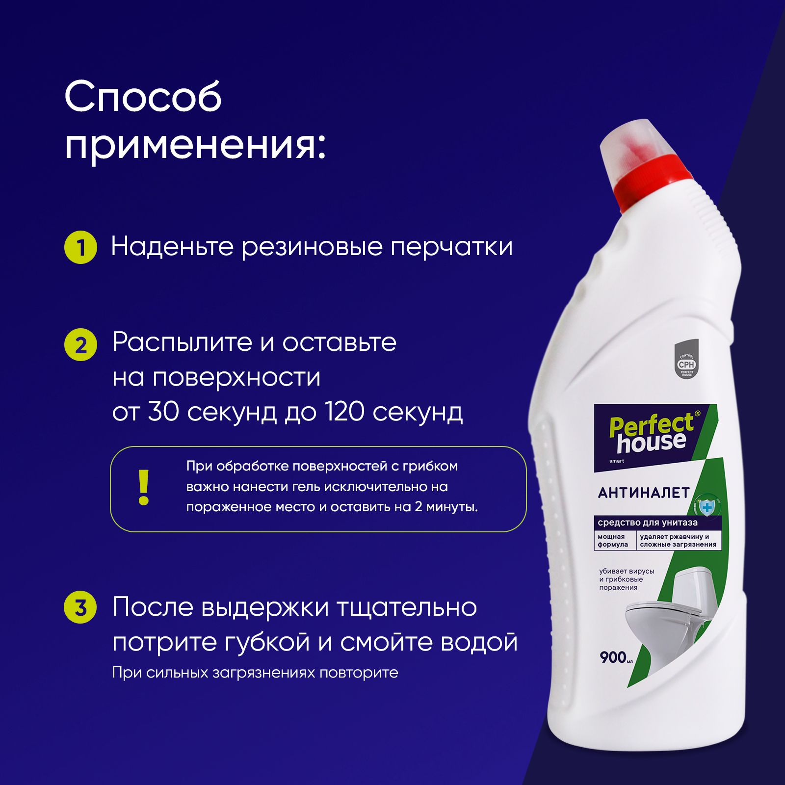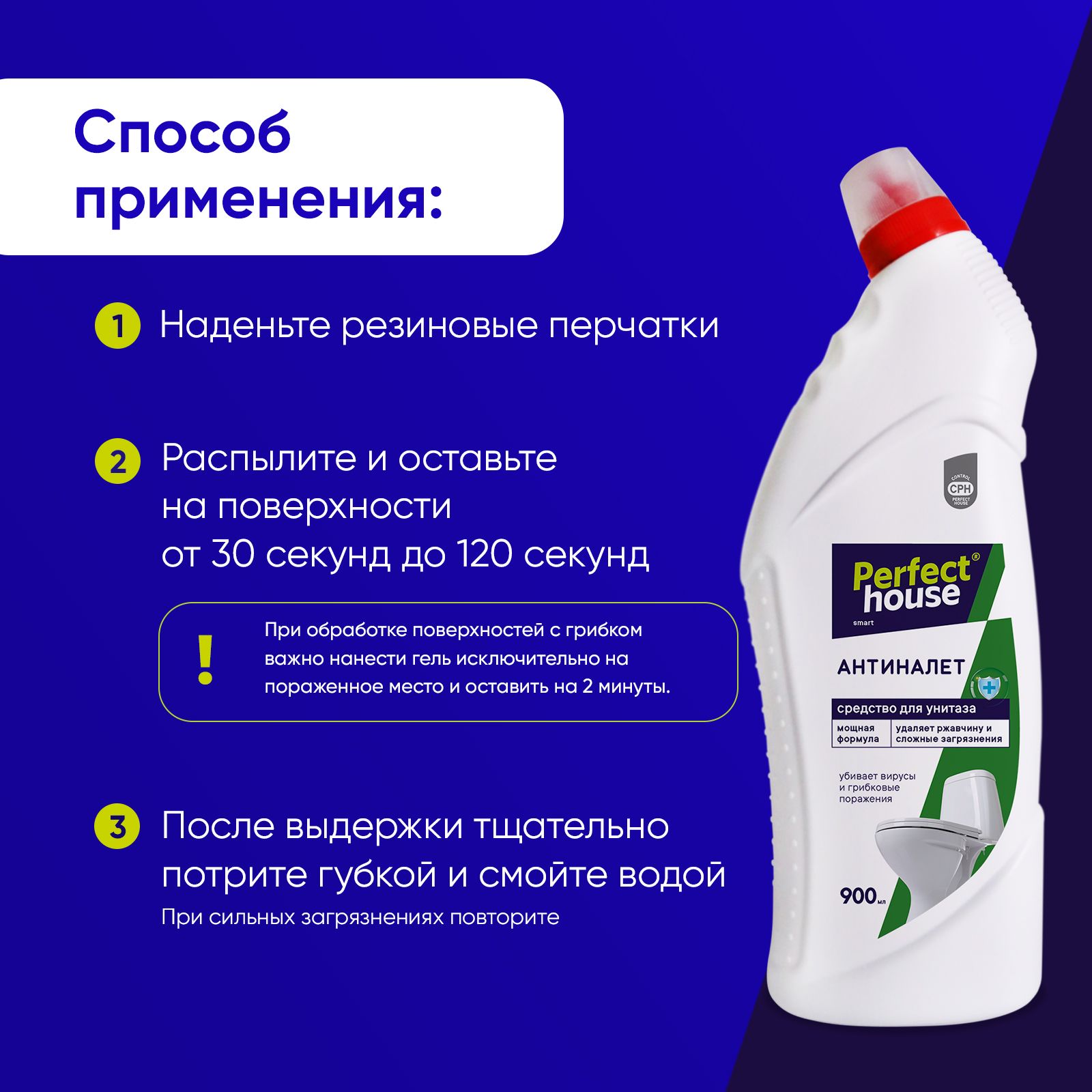 Способ применения:наденьте резиновые перчатки и нанесите средство для мытья на очищаемую поверхность до 2 минут, после выдержки тщательно смойте водой.