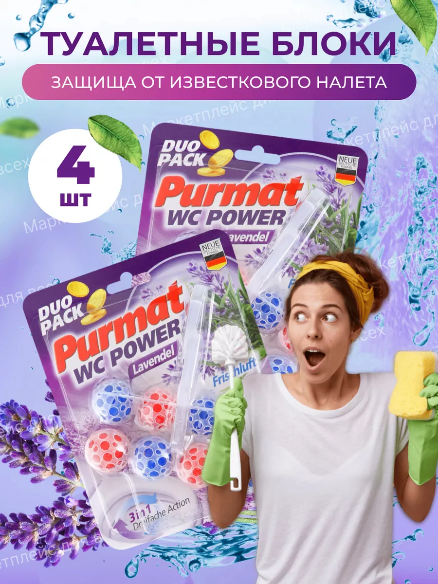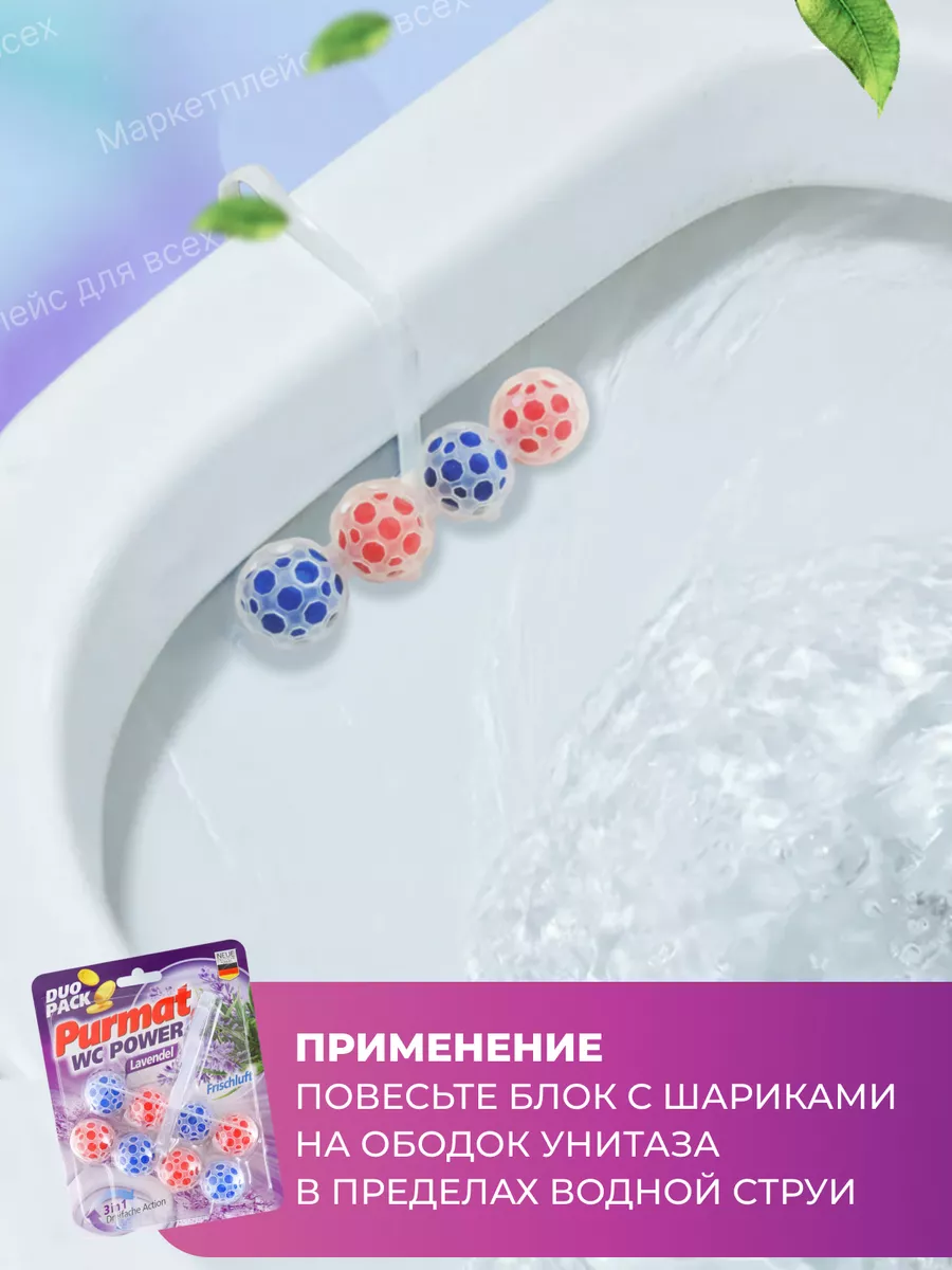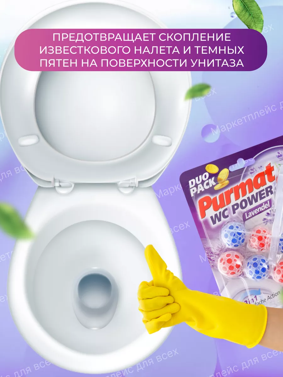 Описание: Туалетный сменный подвесной блок Purmat - это эффективное средство для поддержания гигиены, чистоты, свежести и комфорта в Вашем туалете. Он состоит из шариков с ароматом лимона и лаванды, которые постепенно растворяются в воде и образуют пену. Шарики для унитаза с формулой 4 в 1 намного практичнее, чем таблетки, капсулы, стики, полоски или гель: чистота, защита, свежесть и пена. Как говорится - дешево и сердито. Держатель под ободок устанавливается на кромку унитаза с помощью специального крепления. Он не мешает смыву воды и не оставляет следов на поверхности, безопасен для септиков и не содержит хлора и фосфатов. Чистящее эко средство для унитаза ПУРМАТ действует в четырех направлениях. Современная формула шариков содержит поверхностно-активные вещества и неорганические соли (соляная кислота), благодаря чему обеспечивает гигиеническую чистоту, защиту от бактерий, а значит здоровье и безопасность для всей семьи. Эффективные растворяющие компоненты для чистки в составе дозатора защищают от известкового налета и мочевого камня. Использование блока убережет Вашу сантехнику от ржавчины и надолго продлит эксплуатацию. Средство содержит блоки шариков с ароматом Лимонная свежесть и Лавандовый бриз. При каждом смывании воздух наполняется ненавязчивым легким ароматом, поэтому нет необходимости использовать дополнительно освежитель или ароматизатор воздуха в туалете. Отличные таблетки очиститель для унитаза частично заменяют любое моющее мыло - аналог дорогих Bref Бреф и Доместос. Туалетный блок для унитаза обеспечивает гигиеническую чистоту, защиту от запаха, обильную пену и эффект белизна антиржавчина. Просто закрепите запасной блок под ободком унитаза рядом со струей воды и наслаждайтесь насыщенной свежестью и чистотой Вашего туалета с каждым смыванием! Средства для унитаза Пурмат помогут Вам поддерживать чистоту и свежесть туалета между генеральными уборками до 3-4 недель, достаточно для 300 смывов. Дезинфицирующее средство для очищения туалета Purmat синего и желтого цвета это простой и удобный способ сделать ваш туалет идеально чистым и ароматным.
