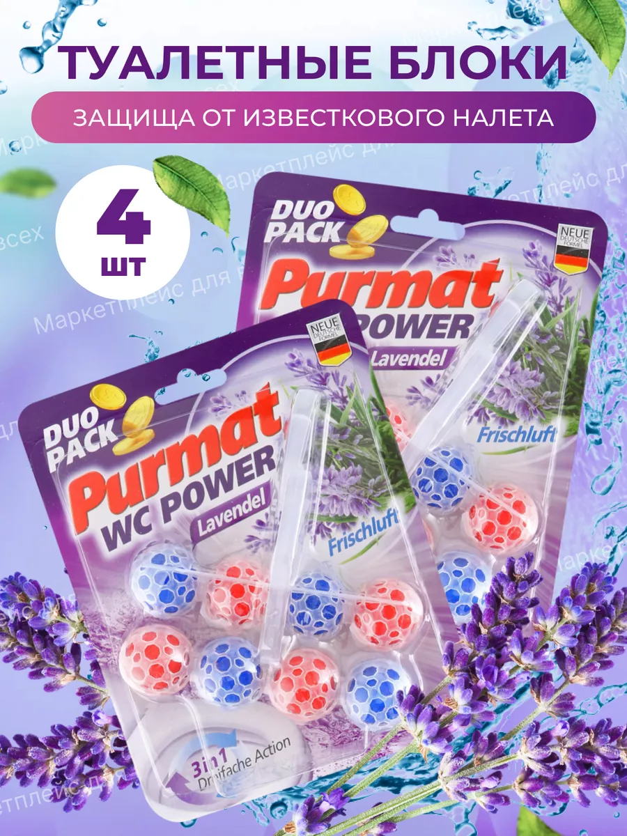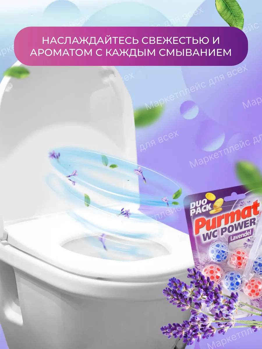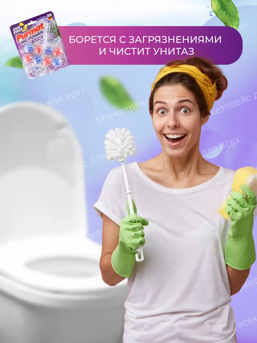 Описание: Туалетный сменный подвесной блок Purmat - это эффективное средство для поддержания гигиены, чистоты, свежести и комфорта в Вашем туалете. Он состоит из шариков с ароматом лимона и лаванды, которые постепенно растворяются в воде и образуют пену. Шарики для унитаза с формулой 4 в 1 намного практичнее, чем таблетки, капсулы, стики, полоски или гель: чистота, защита, свежесть и пена. Как говорится - дешево и сердито. Держатель под ободок устанавливается на кромку унитаза с помощью специального крепления. Он не мешает смыву воды и не оставляет следов на поверхности, безопасен для септиков и не содержит хлора и фосфатов. Чистящее эко средство для унитаза ПУРМАТ действует в четырех направлениях. Современная формула шариков содержит поверхностно-активные вещества и неорганические соли (соляная кислота), благодаря чему обеспечивает гигиеническую чистоту, защиту от бактерий, а значит здоровье и безопасность для всей семьи. Эффективные растворяющие компоненты для чистки в составе дозатора защищают от известкового налета и мочевого камня. Использование блока убережет Вашу сантехнику от ржавчины и надолго продлит эксплуатацию. Средство содержит блоки шариков с ароматом Лимонная свежесть и Лавандовый бриз. При каждом смывании воздух наполняется ненавязчивым легким ароматом, поэтому нет необходимости использовать дополнительно освежитель или ароматизатор воздуха в туалете. Отличные таблетки очиститель для унитаза частично заменяют любое моющее мыло - аналог дорогих Bref Бреф и Доместос. Туалетный блок для унитаза обеспечивает гигиеническую чистоту, защиту от запаха, обильную пену и эффект белизна антиржавчина. Просто закрепите запасной блок под ободком унитаза рядом со струей воды и наслаждайтесь насыщенной свежестью и чистотой Вашего туалета с каждым смыванием! Средства для унитаза Пурмат помогут Вам поддерживать чистоту и свежесть туалета между генеральными уборками до 3-4 недель, достаточно для 300 смывов. Дезинфицирующее средство для очищения туалета Purmat синего и желтого цвета это простой и удобный способ сделать ваш туалет идеально чистым и ароматным.
