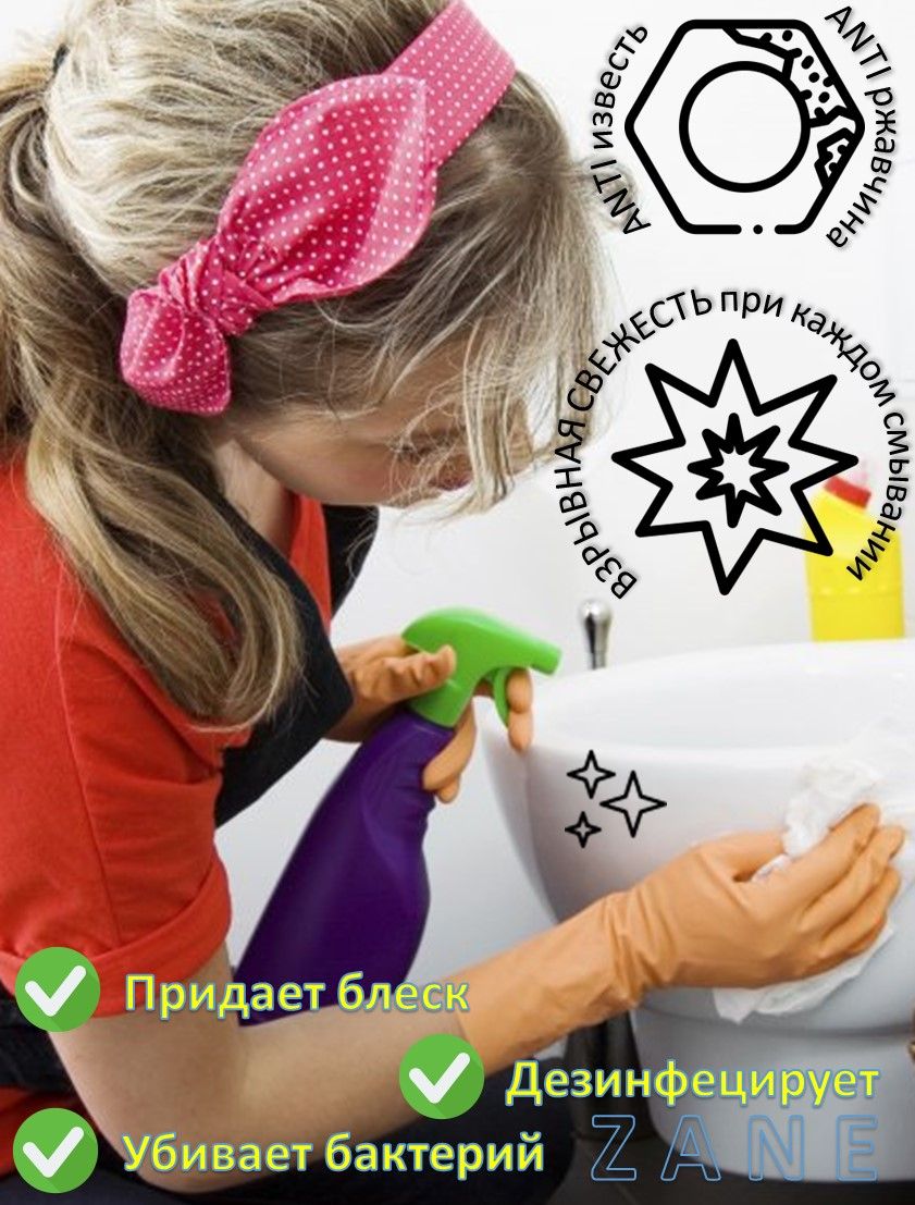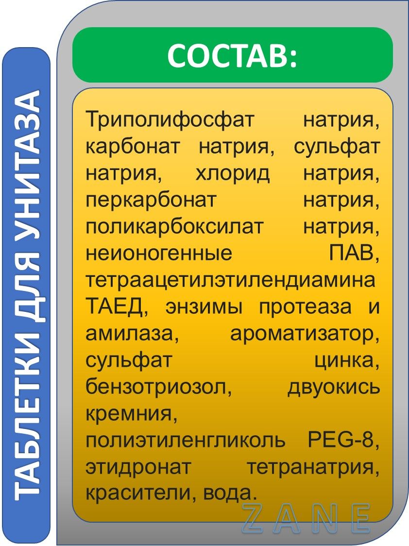 Текст при отключенной в браузере загрузке изображенийВ ассортименте таблетки для унитаза с ароматом лимона, хвои, морской свежести. Их применение позволяет наполнить туалетную комнату любым понравившимся запахом. Своевременное очищение деталей смывного бачка чистящим средством для туалета продлевает срок их службы и долго позволяет поддерживать их в исправном состоянии. Согласно многочисленным отзывам покупателей, таблетки для сливного бачка унитаза очень удобны в обращении. Для того чтобы ими воспользоваться, нужно просто опустить такую таблетку в унитазный бачок. В отличие от других средств, закрепляемых непосредственно в чаше унитаза, таблетки не требуют дополнительных удерживающих креплений. Очищающие таблетки имеют достаточно долгий срок действия. Их хватает на большое количество смывов унитаза, что очень удобно. На протяжении определенного времени таблетка будет растворяться, выпуская в воду активные вещества. Благодаря этому вода не только очистит детали самого бачка, но и при каждом смыве, будет оказывать освежающее и дезинфицирующее действие на унитаз. Кроме чистящих, ароматизирующих и антибактериальных веществ в состав таких таблеток для унитаза обязательно входит красящее вещество. Его задача – показывать присутствие действующих веществ таблетки в смывной воде. Исчезновение окраски в воде говорит о том, что таблетка полностью растворилась. А, значит, пора поместить в бачок новую порцию такого чистящего средства для туалета!                      Таблетки Zane - с заботой о чистоте вашего дома!