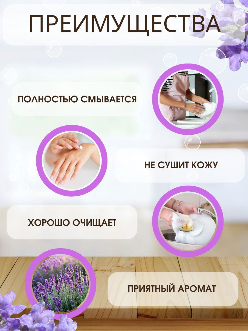 >30% вода природная очищенная, >30% анионные ПАВ, >5<15% неионогенные ПАВ, <5% гидротропы, <5% отдушка парфюмерная, <5% эфирное масло лаванды, <5% пропилпарабен, <5% краситель CI 19140/CI 42051.