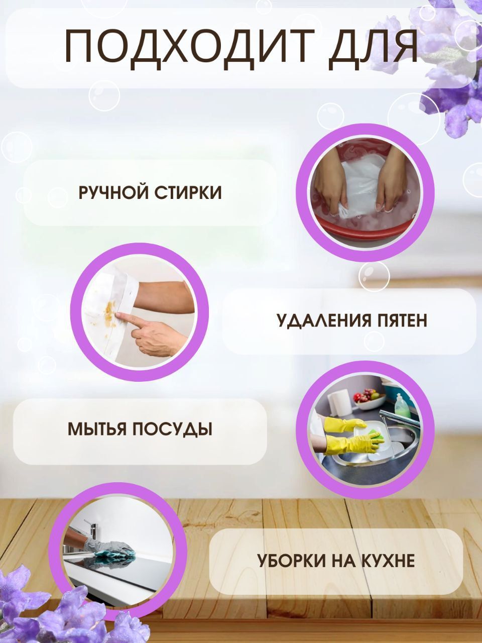 1) Использовать в неразбавленном виде, предварительно нанеся на губку или ветошь. Эффективно как высококонцентрированное средство для мытья посуды, других поверхностей, а также как пятновыводитель фруктовых и других загрязнений.