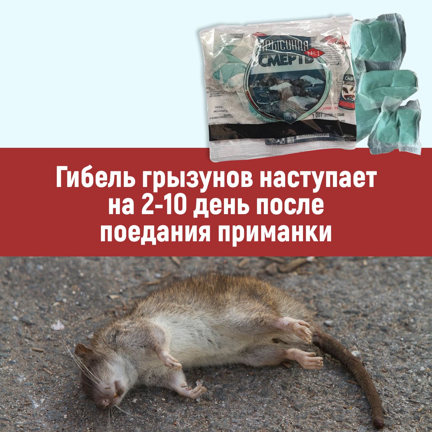 !!! ОБРАТИТЕ ВНИМАНИЕ, ЧТО гибель грызунов наступает на 2-10 день после поедания приманки. НЕ ЖДИТЕ ЧТО ГРЫЗУН УПАДЕТ СРАЗУ ВОЗЛЕ МЕСТА ГДЕ ПОЕЛ ОТРАВУ
