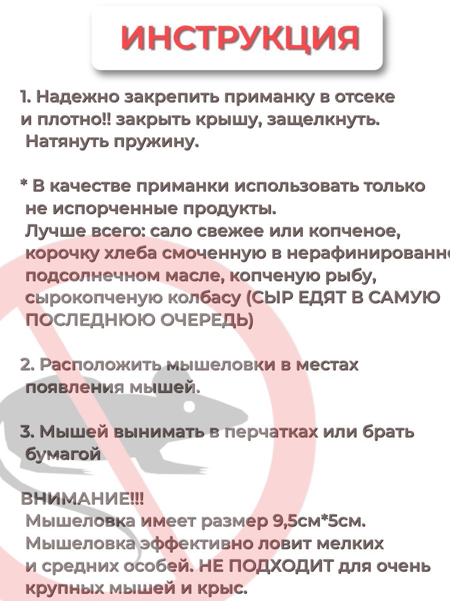 Описание: Комплект пластиковых мышеловок 8шт. Мышеловки выполнены из прочного пластика, скрепленного пружиной. Размеры 5*9,5*5ми.
