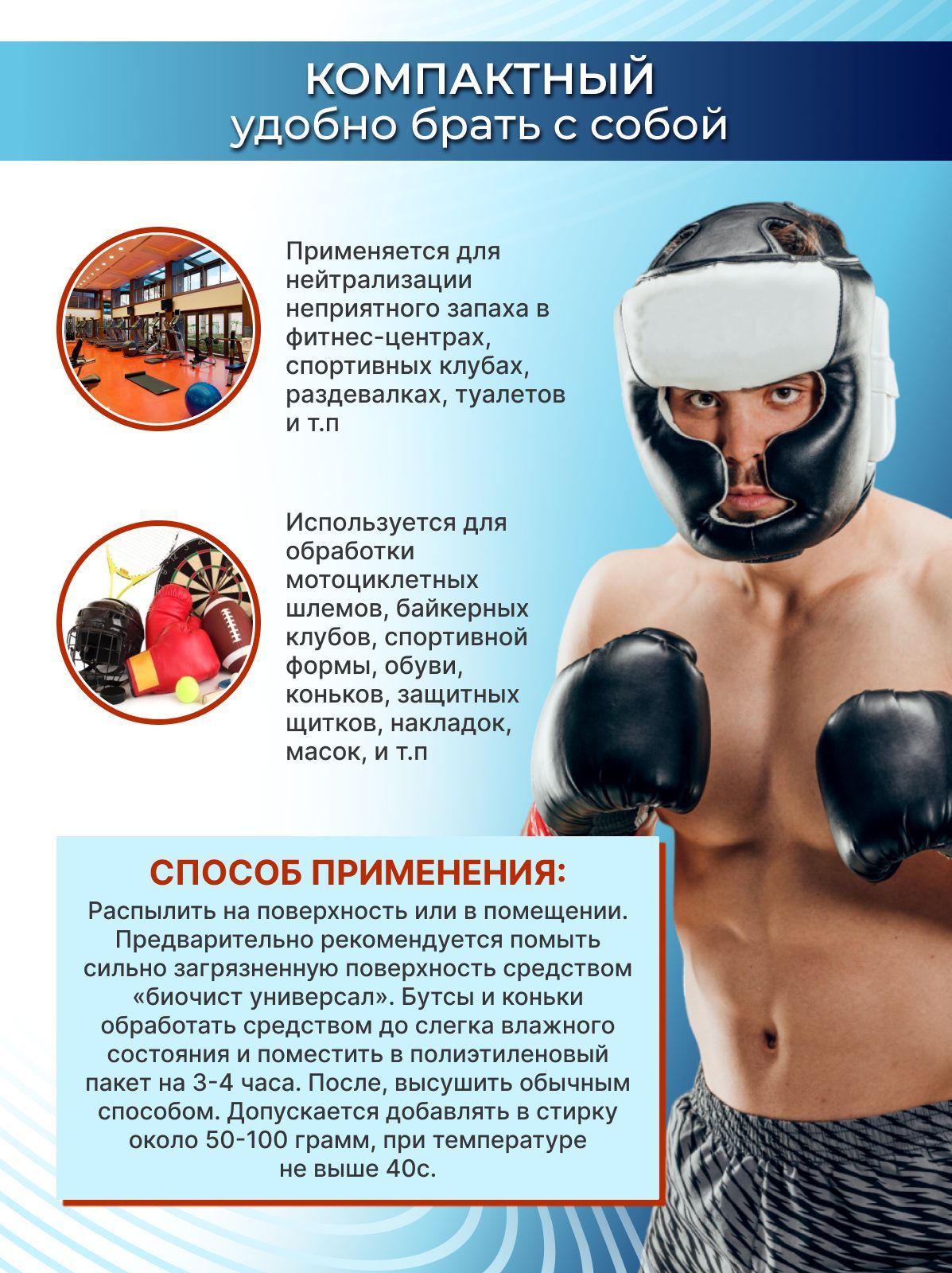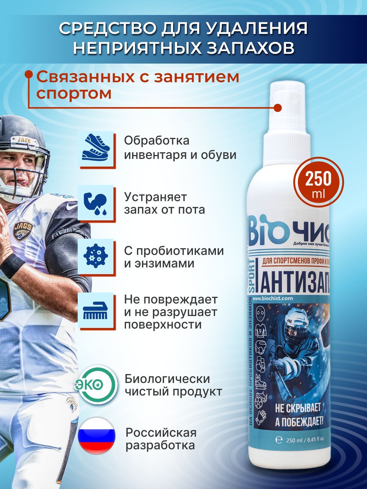 Описание: Поглотитель запаха Биочист Антизапах Спорт - это супер мощный натуральный эффективный спрей удалитель неприятных запахов для спортивной одежды, инвентаря, обуви. Частая неприятная проблема при интенсивных физических нагрузках - это неприятный запах пота. Для борьбы с этим, мы разработали профессиональное средство, которое не маскирует, а борется с причиной возникновения отталкивающих ароматов. Уничтожитель запаха позволяет без труда избавиться от неприятных запахов, как в спортивных раздевалках, клубах фитнес центрах. Его можно использовать как поглотитель запаха для шкафа. Средство от запаха особенно ценно для устранения запахов пота спортивной экипировки и аксессуаров боксеров и хоккеистов, без стирки. Устранение запаха происходит на молекулярном уровне. Благодаря уникальной формуле, после обработки материал и поверхности не повреждаются. Удобный флакон с распылителем 250 мл всегда можно взять с собой и он окажется под рукой в нужный момент. Наше средство от запаха обуви способно восстановить свежесть даже самой потной и грязной пары кроссовок. Просто распылите на внутреннюю часть обуви, оставьте на ночь и утром вы проснетесь со свежими ботинками. Удалитель запахов работает как поглотитель запаха для обуви, средство для обуви от запаха, нейтрализатор запаха мочи, спрей для ног. Важно соблюдать регулярную обработку. При необходимости повторить процедуру еще раз. Мощный, сильнейший и главное натуральный ДЕСТРУКТОР связывает любые молекулы неприятных запахов (химические, органические). Навсегда блокирует летучие молекулы зловонных запахов и не дает им раскрыться вновь. НАТУРАЛЬНЫЕ ОТДУШКИ Европейского производства. ПРОБИОТИКИ, входящие в состав средства разрушают органику даже в самых труднодоступных местах, перерабатывая ее на воду, углекислый газ и сухой остаток без запаха! Биоферментные препараты, входящие в состав экологического средства, имеют продолжительное действие работы микроорганизмов, которые используют зловонную органику как пищу. При регулярной обработке спортивных тренажеров, снаряжения, спортивного инвентаря, обмундирования, ковриков, спортивных сумок аромат чистоты и свежести вас порадует. Ликвидатор запаха не оставляет следов и пятен, не требует смывания. Биочист Антизапах Спорт создан для экономии ваших средств и времени с заботой о вас! Рекомендуем обратить внимание на весь наш ассортимент продуктов с пробиотиками от БИОЧИСТ. Команда бренда Биочист всегда следит за качеством выпускаемой продукции. Все средства линейки Биочист производятся в России, соответствуют всем экологическим требованиям и имеют сертификаты соответствия. Будем рады вашим отзывам. Будем рады вашим отзывам. С Уважением, команда БИОЧИСТ.