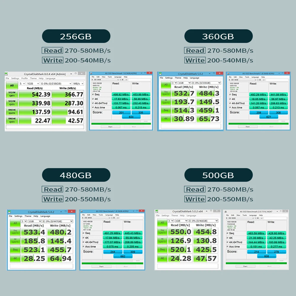 Наш тест скорости на рабочем столе определенной конфигурации, Интерфейсе sataIII, кабеле sataIII, без операционной системы. Результат теста только для справки. Твердотельный накопитель SATA3.0 протестирован на интерфейсе SATA2.0 и кабеле SATA2.0, скорость ниже 300 МБ/с. Ноутбук будет ниже, чем настольный компьютер, и будет нестабильным.