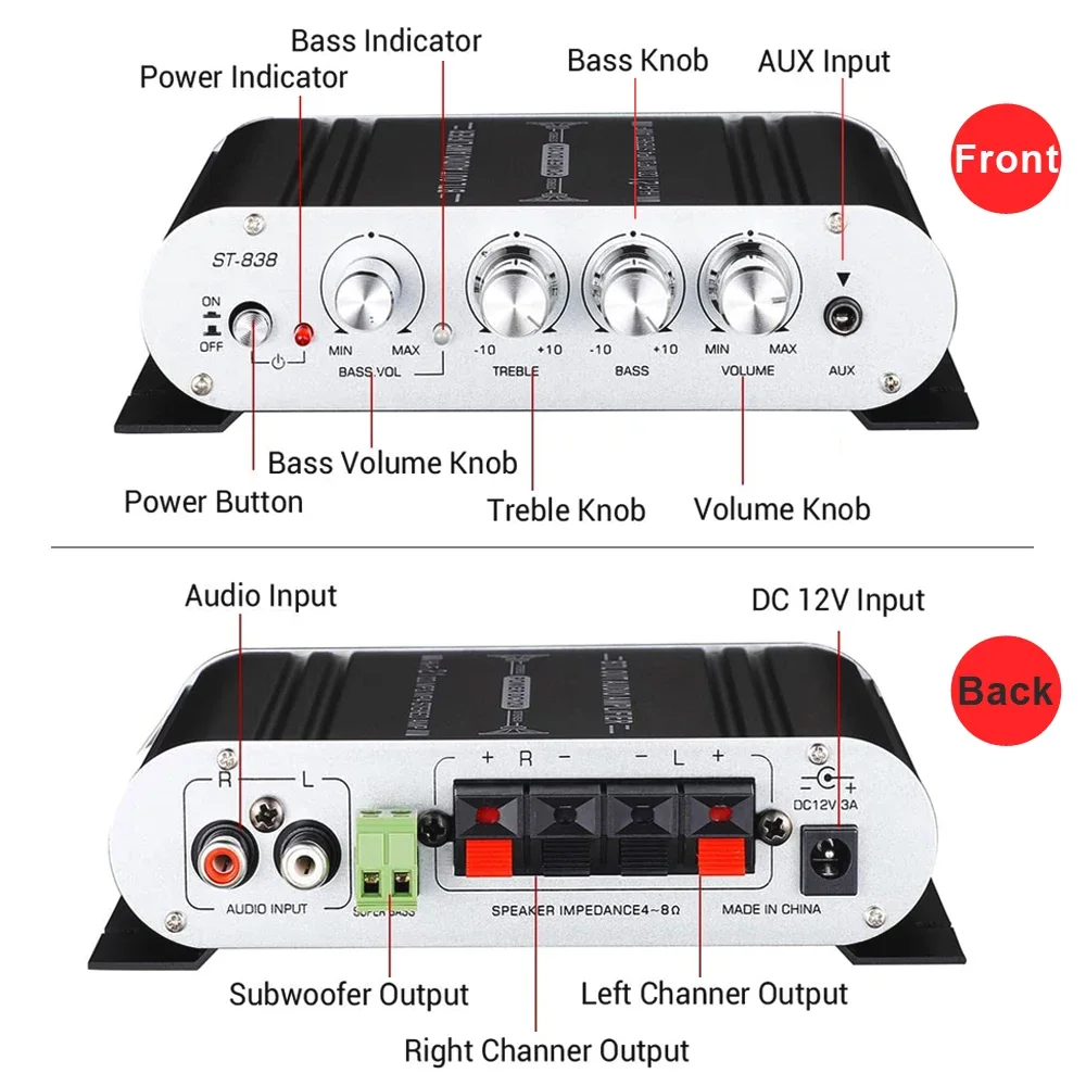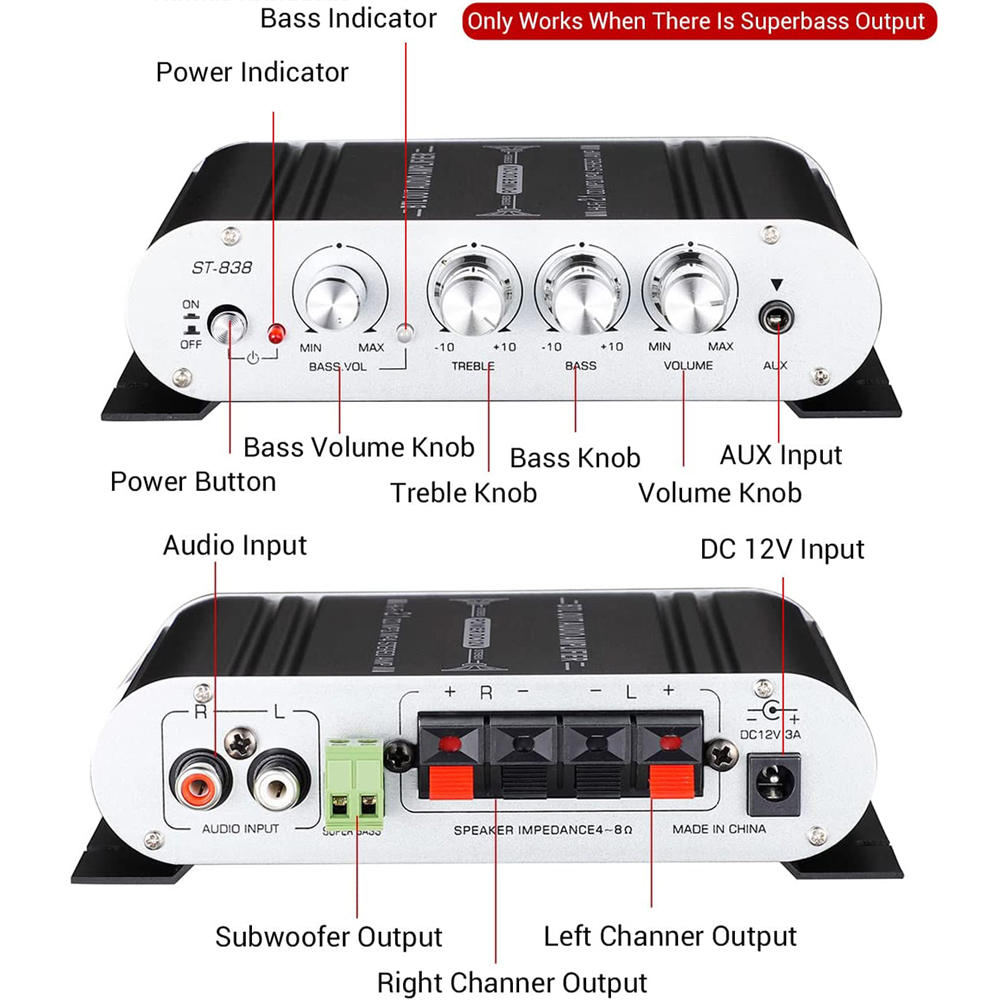 ✔2,1 Канал с выходом 20 Вт × 2 (л/г) + 40 Вт (суб) может управлять большинством пассивных динамиков и сабвуферов дома/автомобиля/лодки/улицы с отличным звуком.