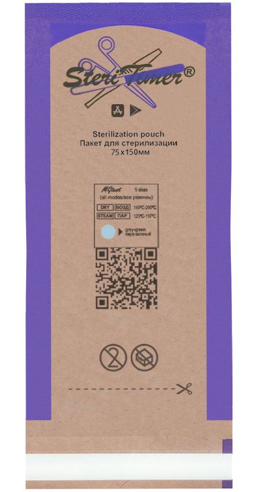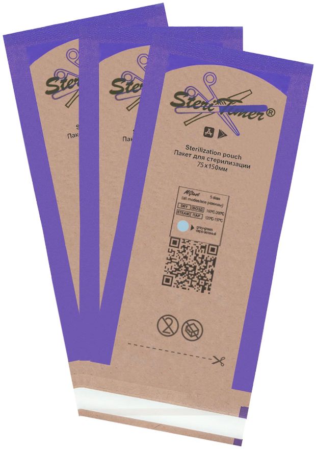 Описание: Универсальные крафт пакеты для упаковки и стерилизации инструментов воздушным и паровым способами размером 75x150мм. Плотность бумаги 78г/м2, химический индикатор 5 класса по ГОСТ ISO 11140-1-2011.