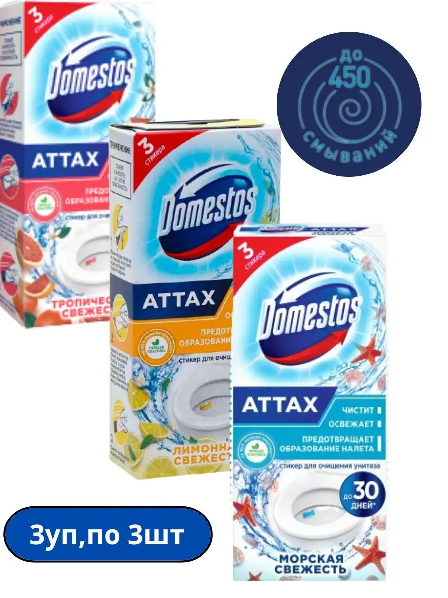 Описание: Стикер для очищения унитаза Domestos Attax вся сила Domestos для чистоты и свежести Вашего унитаза. Одна упаковка обеспечивает чистоту, свежесть и гигиену до 450 смываний.