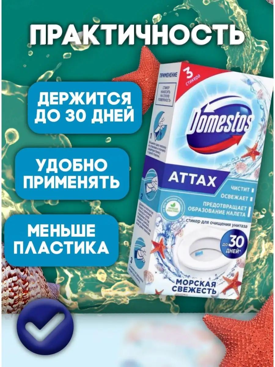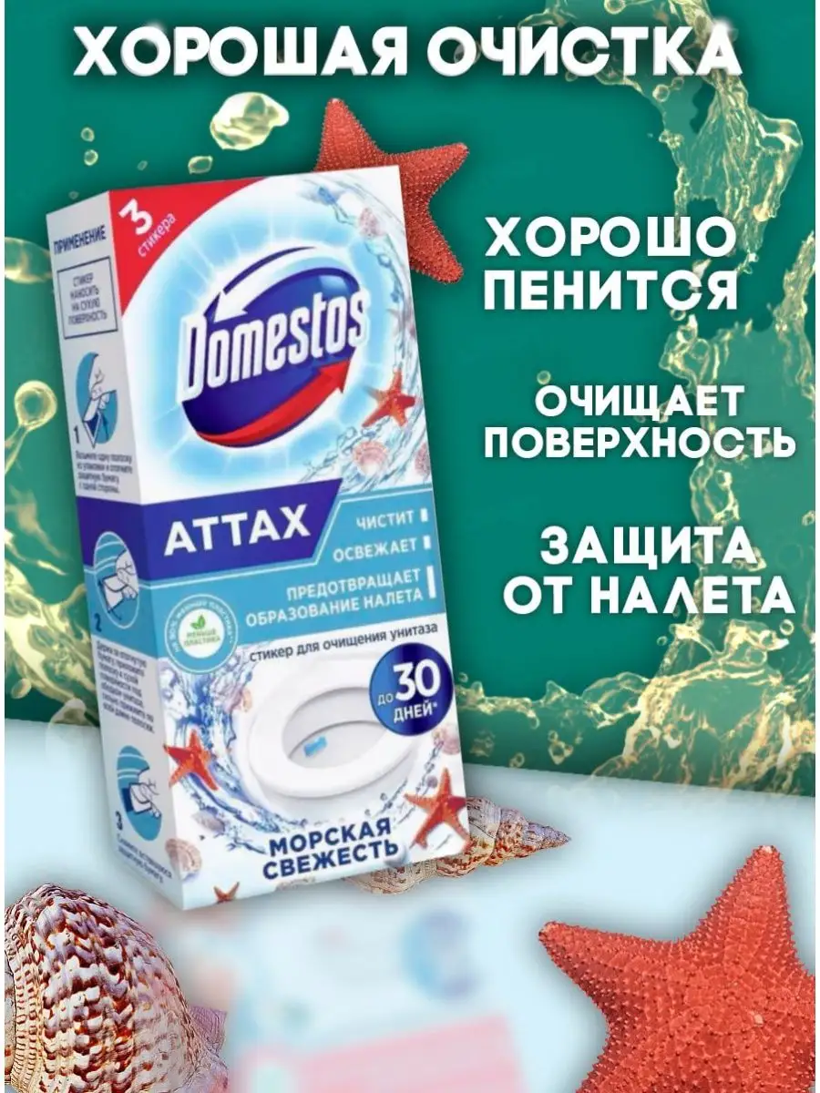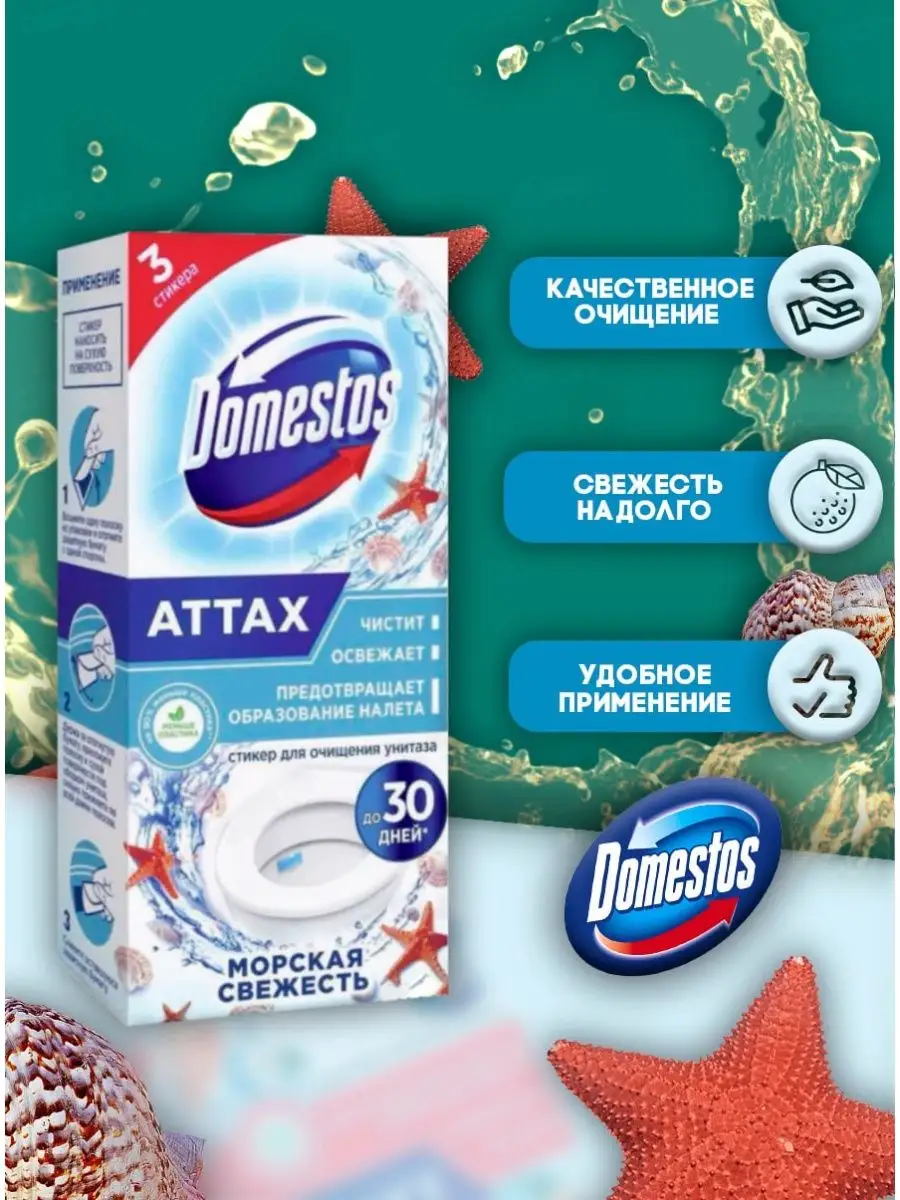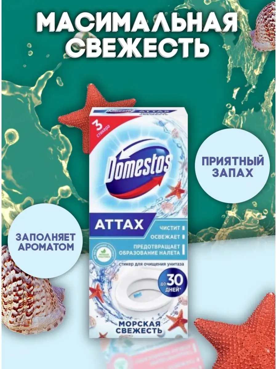 Описание: Стикер для очищения унитаза Domestos Attax Морская Свежесть — это антибактериальный стикер, который поможет дольше сохранять чистоту и свежесть унитаза. Доместос стикер — это средство для туалета с мощной формулой, которое уничтожает неприятные запахи и помогает поддерживать гигиену унитаза. Туалетные стикеры для унитаза Доместос Морская Свежесть обладают компактным внешним видом — отсутствие держателя делает их практически незаметными и не требует утилизации пластиковых отходов. Антибактериальный стикер полностью смывается водой со временем. Domestos для унитаза борется с бактериями при каждом смывании и защищает поверхность унитаза от появления налета, надолго сохраняя чистоту и свежесть. Приятный аромат средства помогает устранить неприятных запах, а сами стикеры доместос для унитаза позволяют без труда поддерживать гигиену в туалете. Domestos Морская Свежесть: -уничтожает неприятные запахи; -легок и гигиеничен в применении; -не требует утилизации отходов после использования; -имеет мощную формулу и приятный аромат; -содержит 3 стикера в комплекте — до 450 смываний. Стикеры для туалета легко купить и использовать: возьмите одну полоску из упаковки и отогните защитную бумагу с одной стороны, приложите полоску к сухой поверхности под ободком унитаза, сильно прижмите по всей длине полоски, снимите оставшуюся защитную бумагу. В комплекте идет 3 стикера, помогающих обеспечить чистоту, свежесть и гигиену до 450 смываний. Продукция Domestos представлена в разных сегментах рынка средств для уборки: чистящие гели, туалетные блоки, универсальные спреи, антибактериальные салфетки, туалетные стикеры для унитаза Доместос. Domestos убивает все известные микробы, помогая обеспечить гигиену дома. На сегодняшний день Domestos является одним из лидеров* на рынке чистящих средств. Способ применения: Стикер наносить на сухую поверхность. Возьмите одну полоску из упаковки и отогните защитную бумагу с одной стороны. Держа за отогнутую бумагу, приложите полоску к сухой поверхности под ободком унитаза, сильно прижмите по всей длине полоски. Снимите оставшуюся защитную бумагу. Состав продукта: с, ароматическе углеводороды, 2-(4-третбутилбензил) пропиональдегид, линалоол, гераниол, альфа-изометил ионон, кумарин. Стик доместос, Стикер для унитаза, стик для унитаза.
