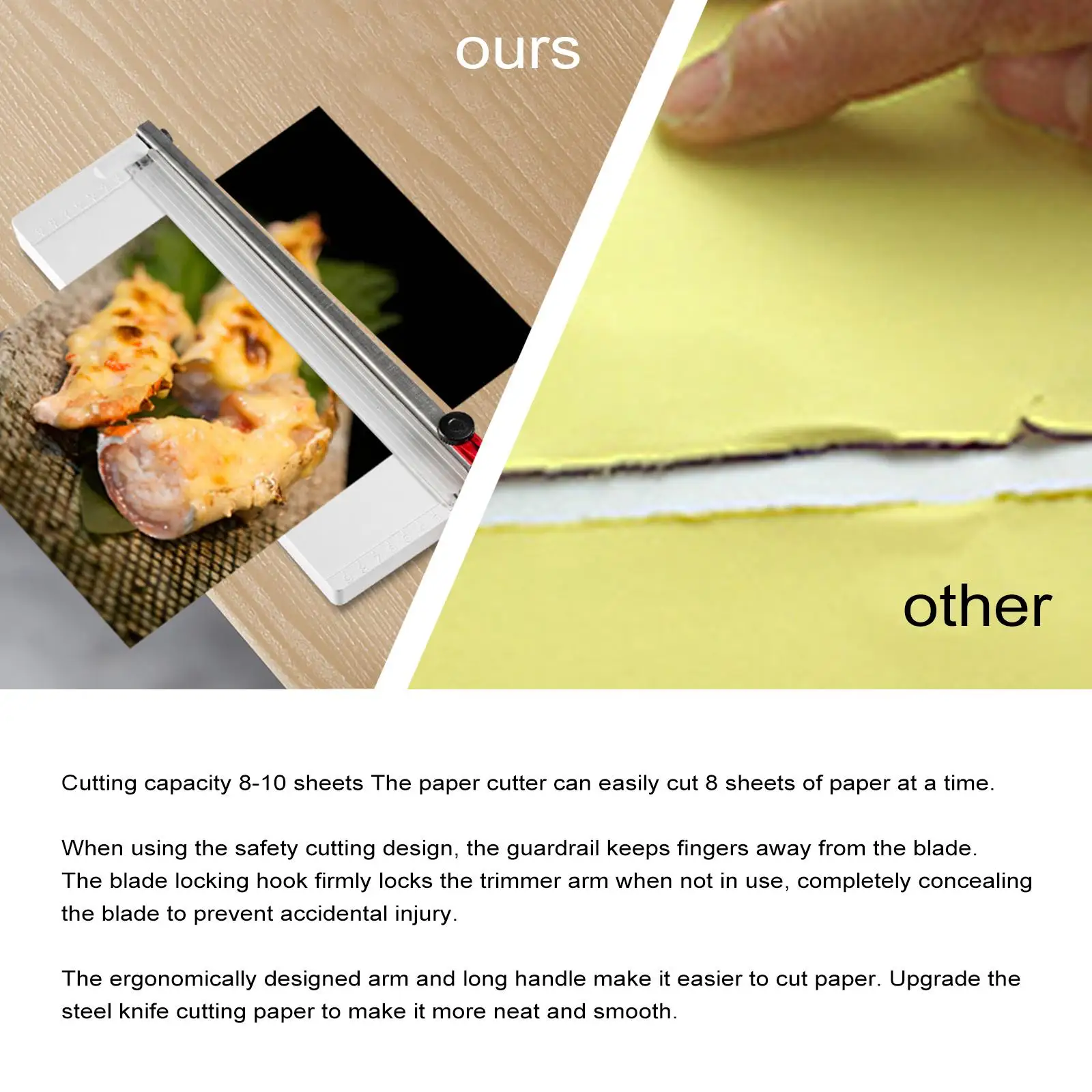 ОТРЕЗАТЬ ВСЕ, ЧТО ВЫ ХОТИТЕ Резак для бумаги удобен для резки фотографий, картинок, этикеток, открыток и других бумажных вещей. Идеально подходит для использования в офисах, школах, дома, типографиях, фотостудиях и т. Д.