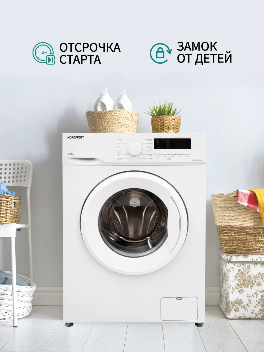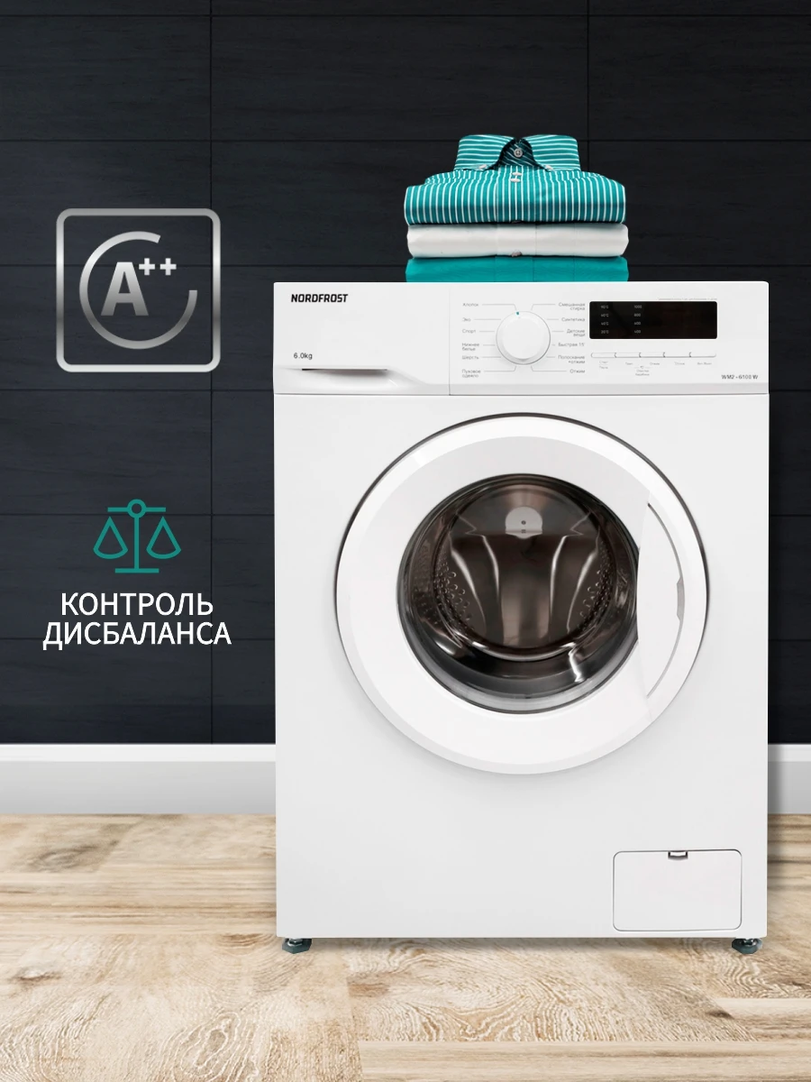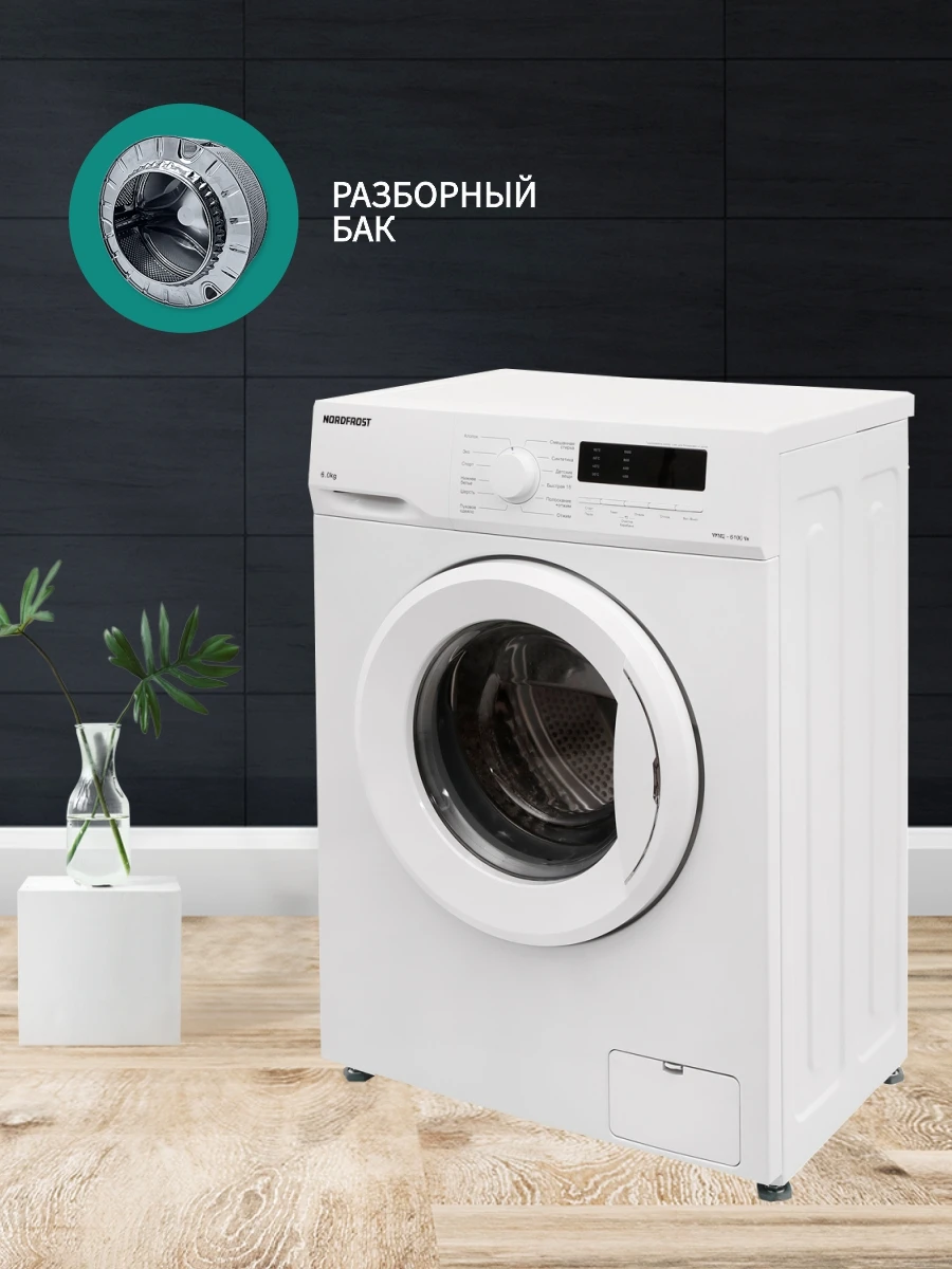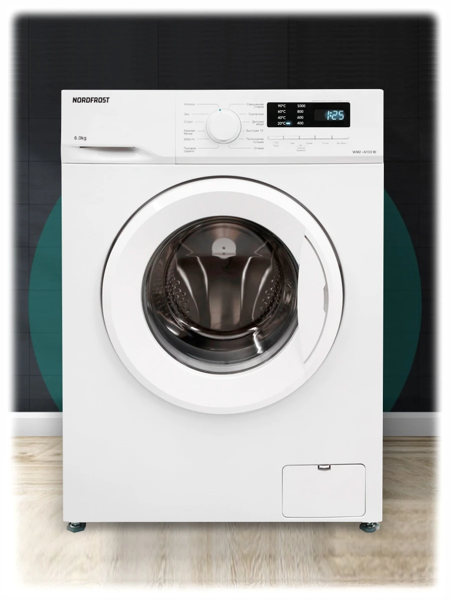 Стиральная машина NORDFROST WM2 6100 W с объемом бака 40 л и загрузкой белья до 6 кг – функциональная, компактная, надежная и понятная в использовании модель, а ее современный и стильный дизайн идеально впишется в интерьер вашей ванной или кухни!