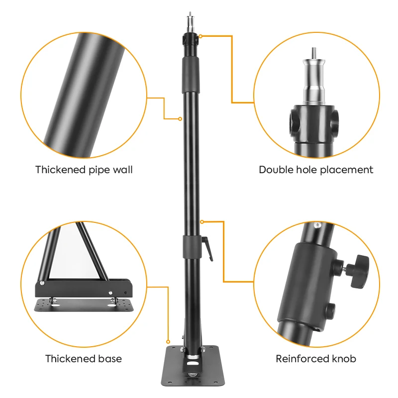 Он поставляется с переходными винтами 3/8 1/4 для кольцевых фонарей, камер, микрофонов, софтбоксов и других устройств.