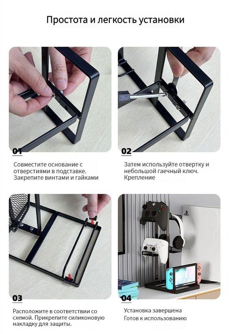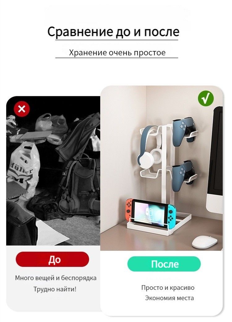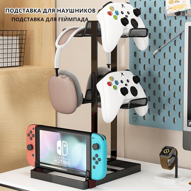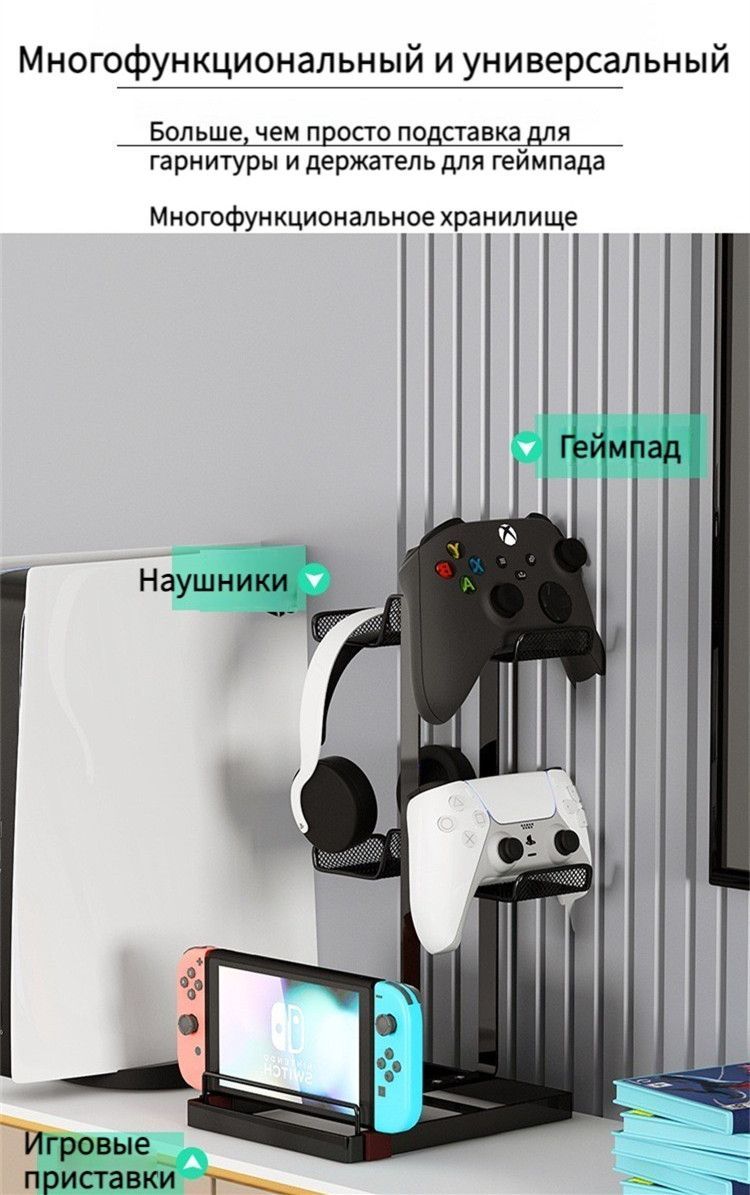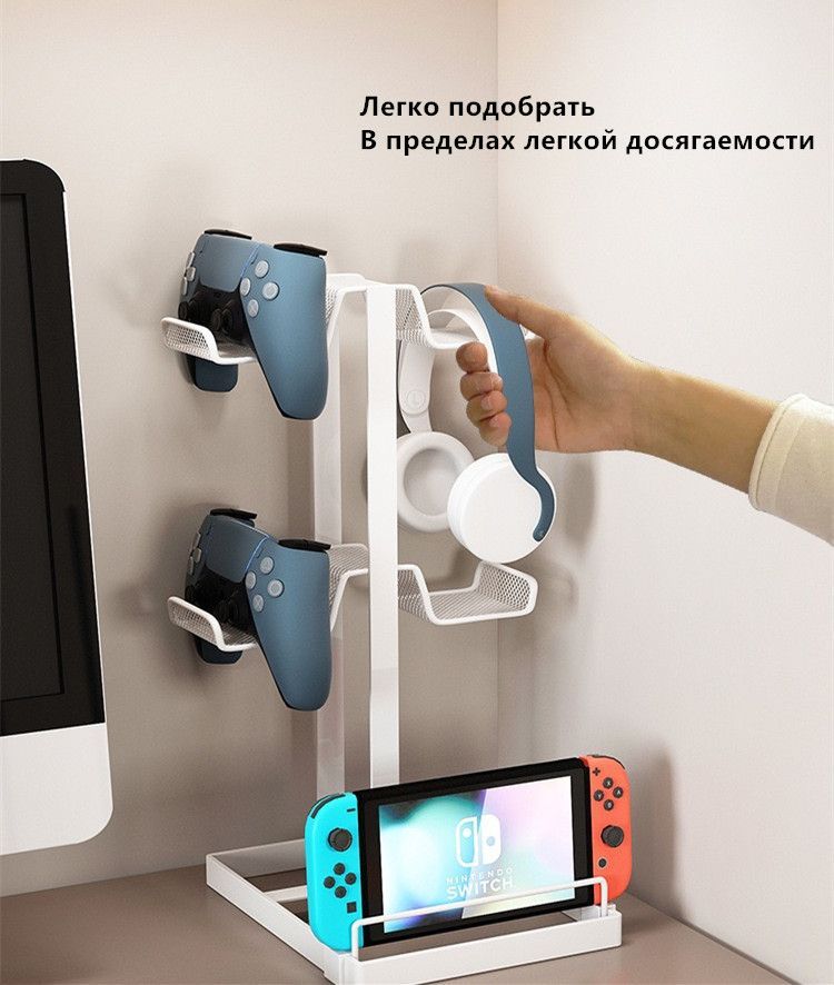 Описание: 【4 Controller Holder】В нем можно разместить до 4 геймпадов, что очень хорошо экономит место, также можно разместить 2 контроллера+2 наушника. Вы можете положить игровой контроллер на подставку во время зарядки, также вы можете повесить гарнитуру и другие предметы.