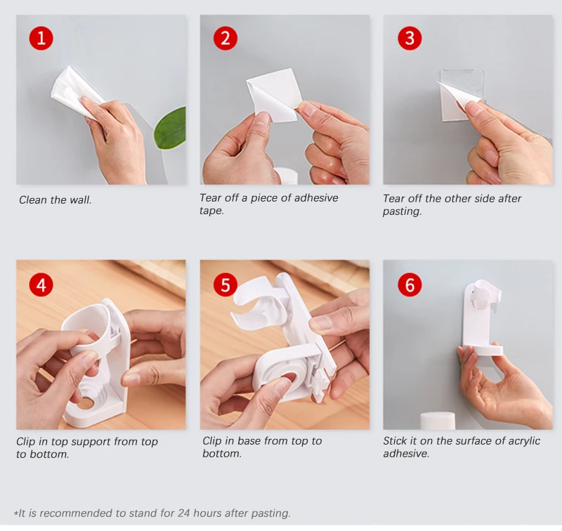 Как использовать: Очистите стену от пыли и масла, держите ее сухой и Взорвите, снимите защитную пленку с липкой ленты и приклейте ее к задней части кронштейна, надавите на него, чтобы выпустить излишки воздуха, вставьте ВЕРХНИЙ держатель в задний кронштейн, Воткните основание в задний кронштейн и приклейте его к стене. Плотно прижмите к лицу и дайте постоять 24 часа перед использованием.