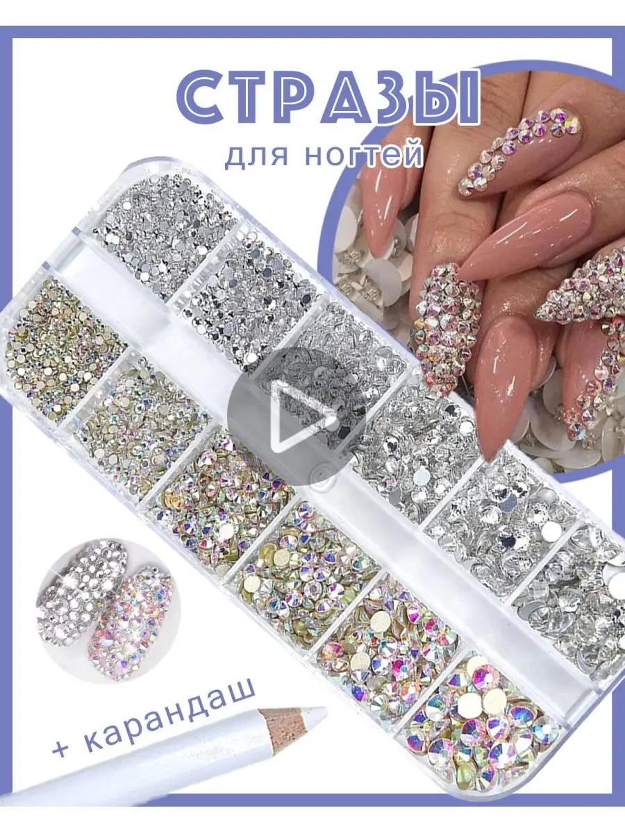 Комплектация Стразы для ногтей творчества маникюра педикюра 2 цветы разных размеров в ячейках; Дизайн маникюра стразы 12 размеров