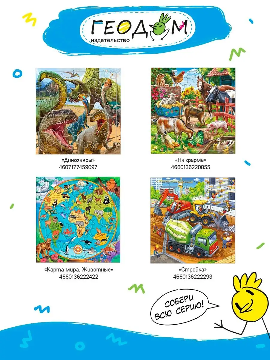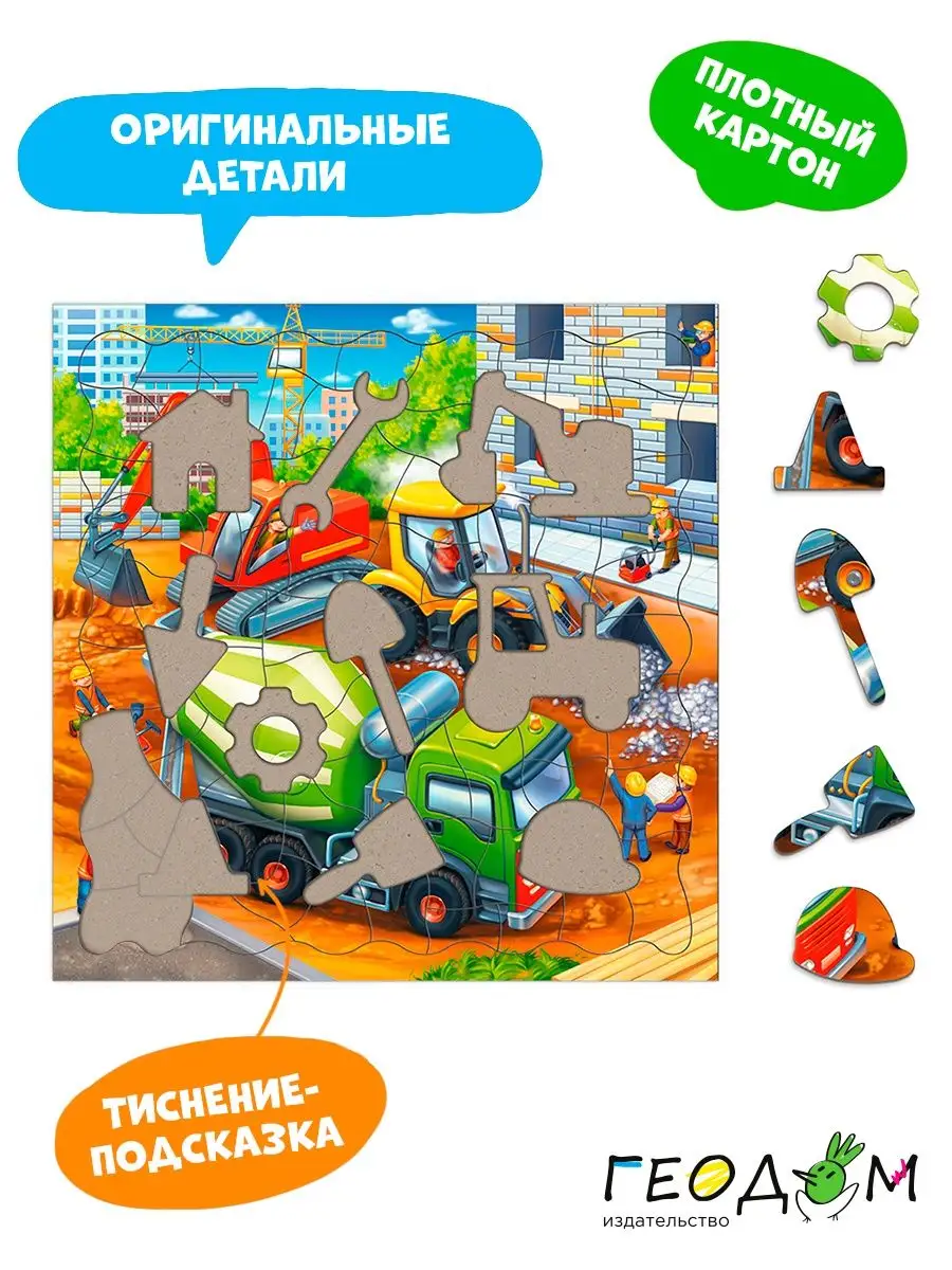 Описание: Фигурный пазл на подложке. Высота собранного пазла 30.5 см, ширина собранного пазла 30 см. Мозаика состоит из 80 штук разных деталей и фигурок, и изготовлена из картона. Интересные картонные пазлы на подложке подойдут для взрослых и детей от 3 лет. В наличие есть несколько разных пазлов с героями любимых мультиков - с машинками, строительной техникой: трактор, подъемный кран, строительный кран, экскаватор, бетономешалка, с динозаврами, с конфетным домиком, с экзотическими животными, с подводным миром, с животными из фермы. Каждый ребенок может выбрать пазл на свой вкус. Такие пазлы будут интересны не только малышам, но и детям 9-11 лет. Благодаря изделию, ребенок узнает что делает самосвал и как отличить экзотических животных от домашних кошечек и собачек. В творческой и игровой форме ребенок получит популярные знания о географии и о мире в целом. Такие обучающие и декоративные пазлы с принтом приносят много радости от занятий, сборки и развлечения. В отличие от обычной мозаики эти необычные и оригинальные пазлы развивают интеллект ребенка не хуже, чем методика Монтессори. Прикольные и необычные пазлы из нескольких разнообразных частей могут показаться сложными, но дети любят непростые задачи. Такая игрушка подойдет и для школьника. Тактильные детальки развивают мелкую моторику рук. Большие puzzle - это развивашки для маленьких девочек и мальчиков полезны для развития памяти и хороши в качестве хобби. Пазлы – это отличные игрушки для детей. С помощью сборки мелких деталей в картинку развивается мелкая моторика и интеллект, память, внимание. Такое занятие подойдет для дома, дачи. Пазлы можно взять с собой в садик или в дорогу, на море или чтобы отвлечь ребенка во время длительной поездки или перелета. Подарочная упаковка товара не требует дополнительной коробки или обертки. Веселые игрушечные фигурки: самосвал, грузовичок, трактор, звери, домик, учат ребенка добру и могут служить игрушкой антистресс. Кроме того готовую картину можно повесить в рамку на стену. Такие пазлы можно собирать много раз всей семьей или одному. Это отличный подарок внуку, сестре, любимой внучке, сыну или дочке, племяннице. Игрушка унисекс подойдет ребенку любого пола. Хорошо дарить на день рождения, Новый год, Рождество. Новогодняя мозаика станет отличным занятием в праздники. Логические игры для развития мозга и рук подойдут в подарок и на выпускной из детского сада. Настольную игру с вкладышами можно подарить и без повода. Она принесет счастье любому ребенку. У нас есть акции и распродажи, вы можете купить наши товары в подарок со скидкой! пазл в рамке . пазлы в рамке