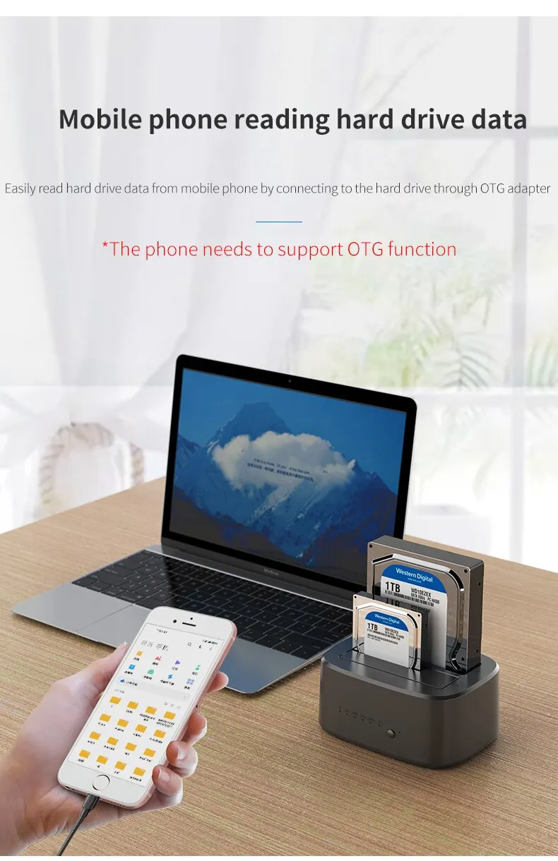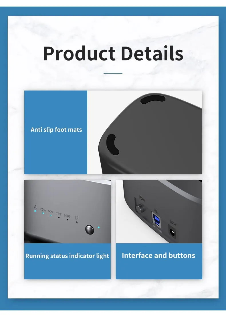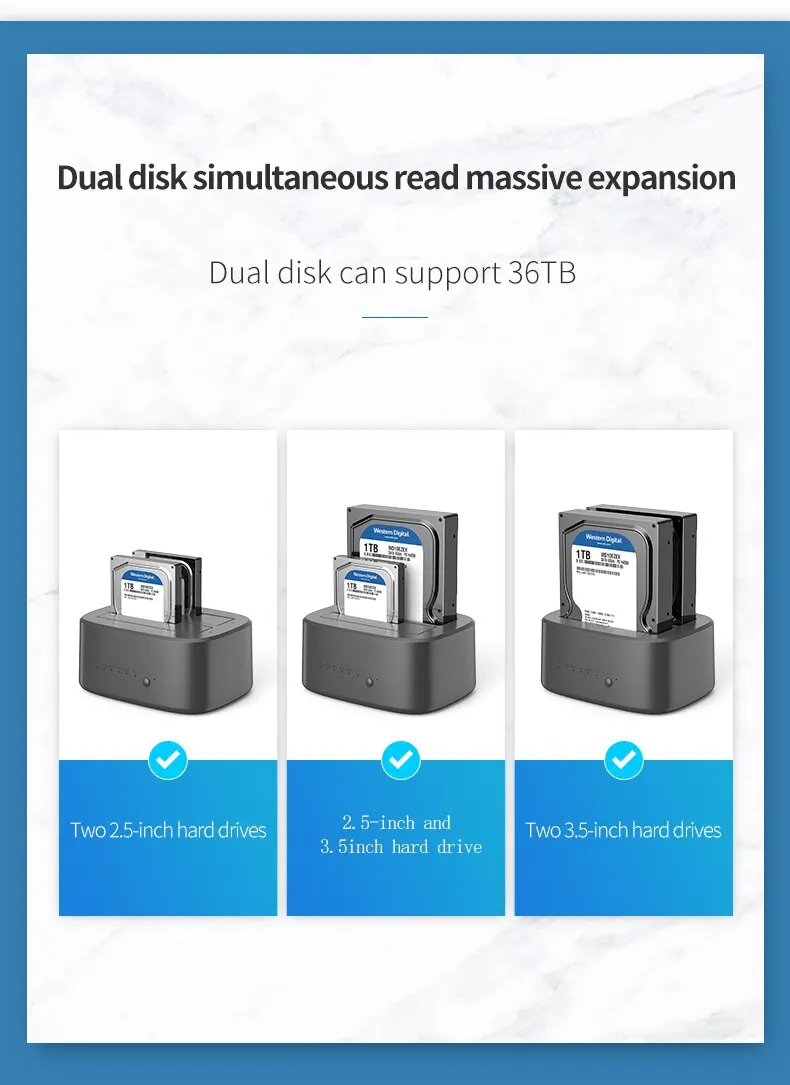 • Дизайн с двумя отсеками :Док-станция для жестких дисков UnionSine Dual Bay позволяет одновременно подключать Два жестких диска или твердотельные накопители, что упрощает резервное копирование и передачу данных.
