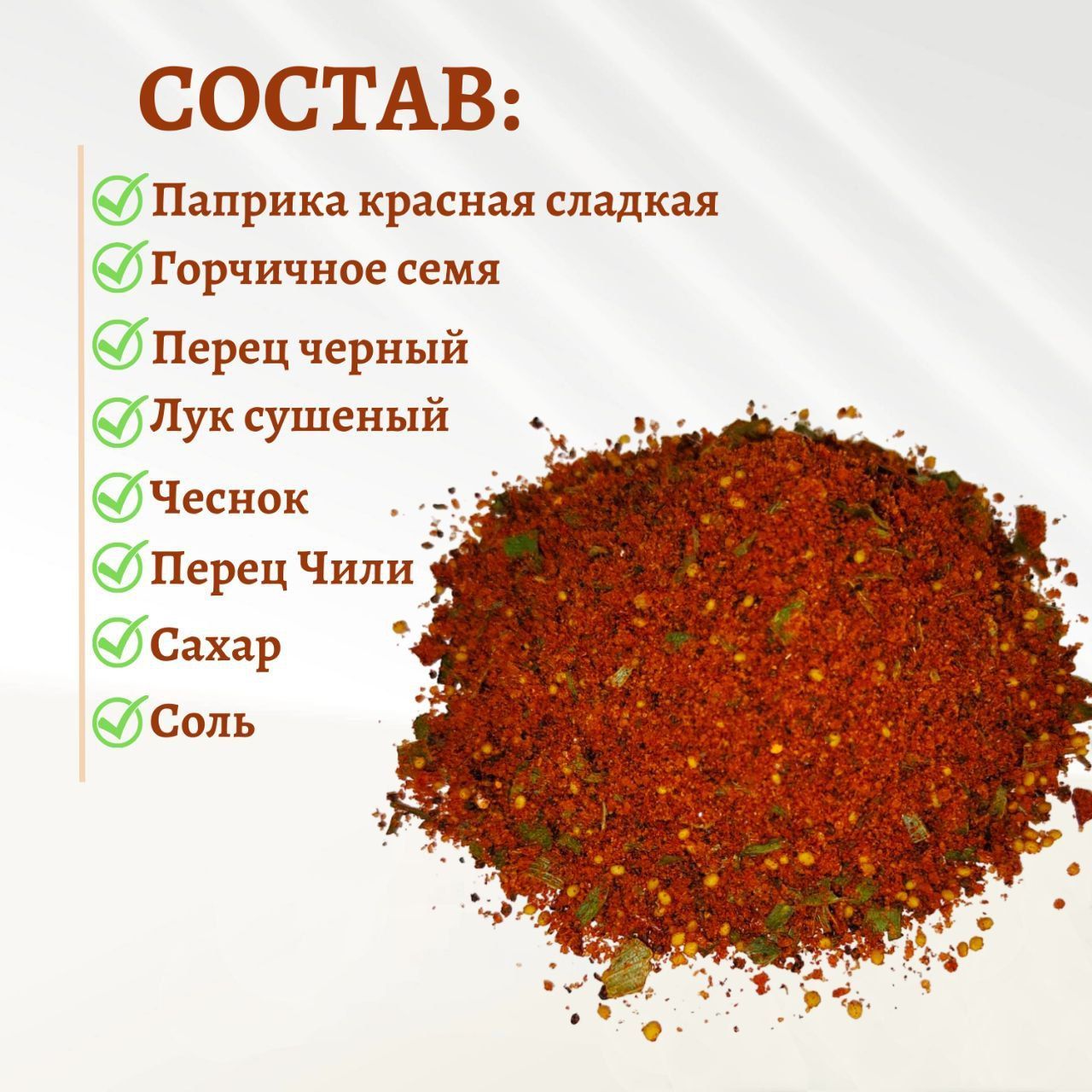 состав: пряности (паприка красная сладкая, горчичное семя, перец черный, лук сушеный, чеснок, перец острый Чили), сахар, соль поваренная, мальтодекстрин, усилитель вкуса и аромата (глутамат натрия), эмульгатор (моноглицериды жирных кислот), загуститель (гуаровая камедь), регулятор кислотности (лимонная кислота), экстракт паприки, ароматизатор