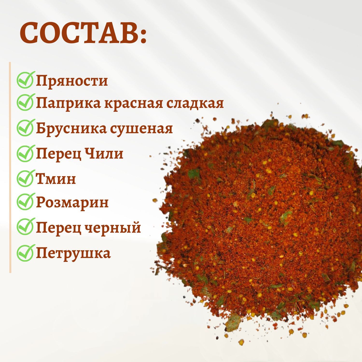 пряности (паприка красная сладкая, брусника сушеная, перец острый Чили, тмин, розмарин, перец черный, петрушка), сахар, мальтодекстрин, усилитель вкуса и аромата, загуститель (гуаровая камедь), антиокислитель лимонная кислота, ароматизатор, консервант сорбат калия