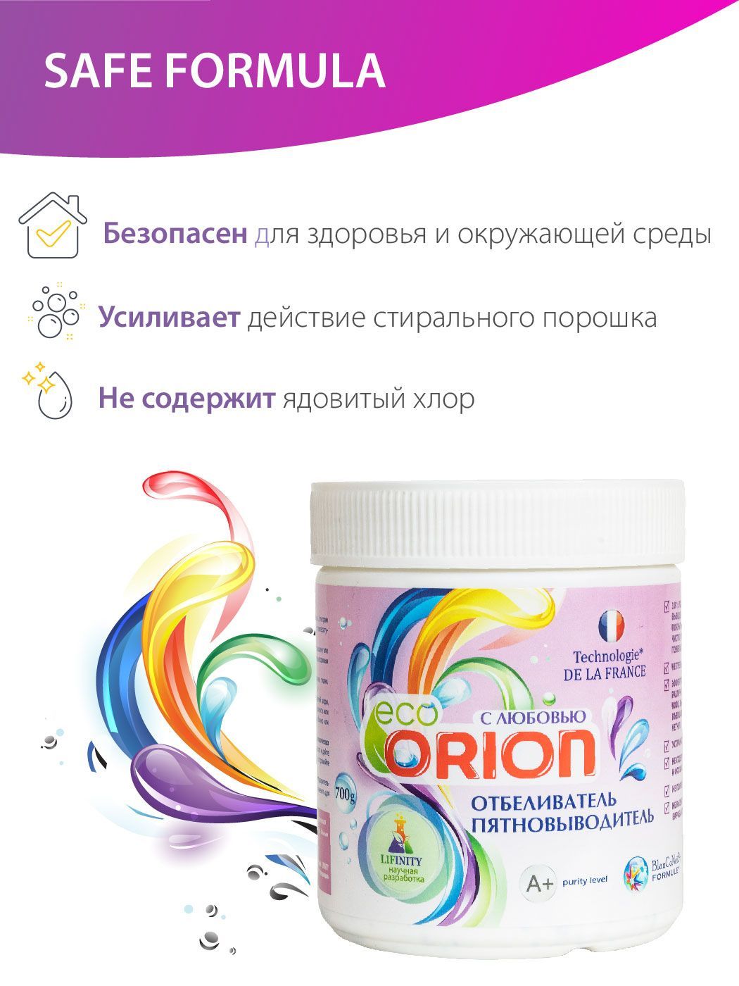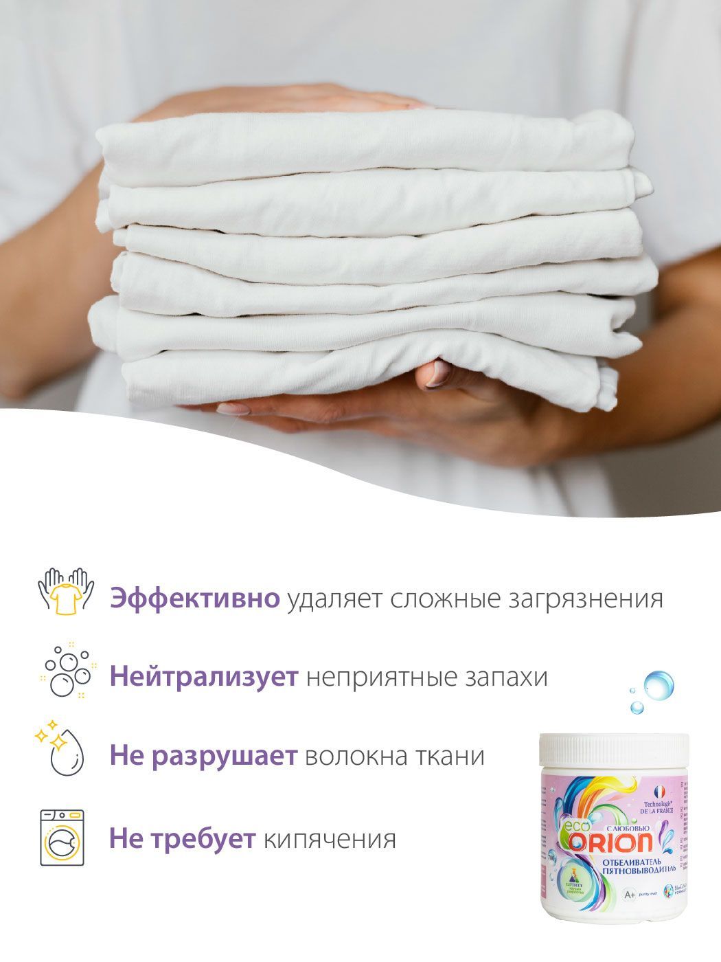Если вы ищите быстрое, надежное и безопасное решение для борьбы с пятнами на одежде и придание максимально белого цвета вашей одежде, сухой пятновыводитель ORION с добавлением отбеливателя станет отличным выбором.
