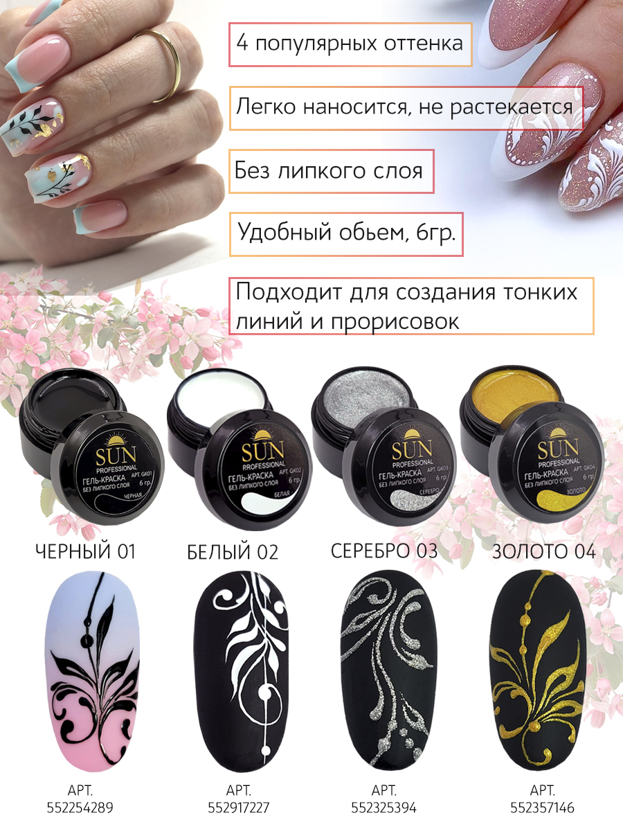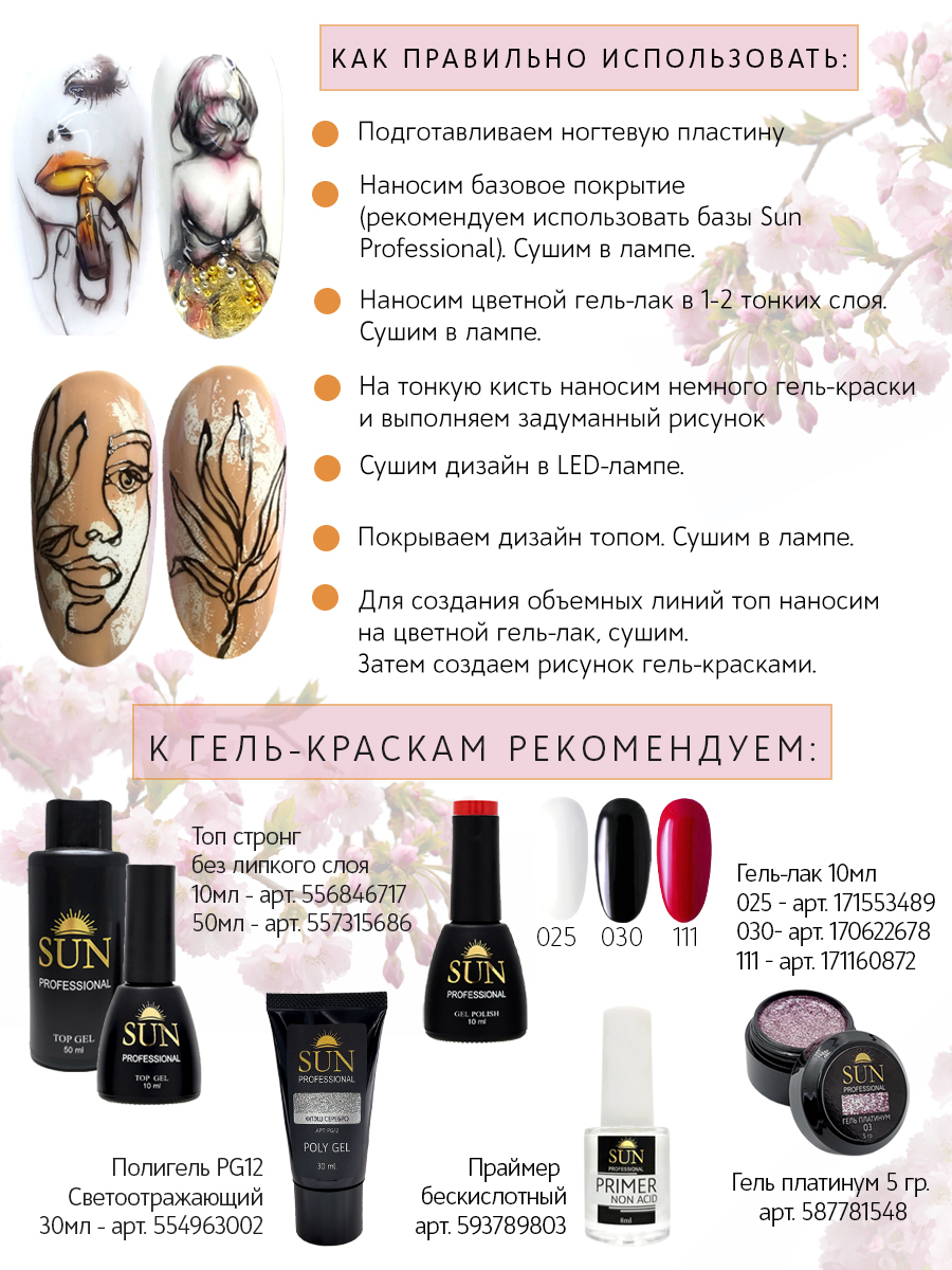 Описание: Текстовое описание изображенияSUN ProfessionalГель-краска Sun Professional предназначена для нейл-дизайна с тонкими четкими линиями и узорами, легко создавать кружевные рисунки и изящные геометрические узоры. Краска для дизайна ногтей имеет густую тягучую консистенцию, не растекается в процессе нанесения и полимеризации. Отсутствие липкого слоя дает возможность работать с продуктом с топом или без него.