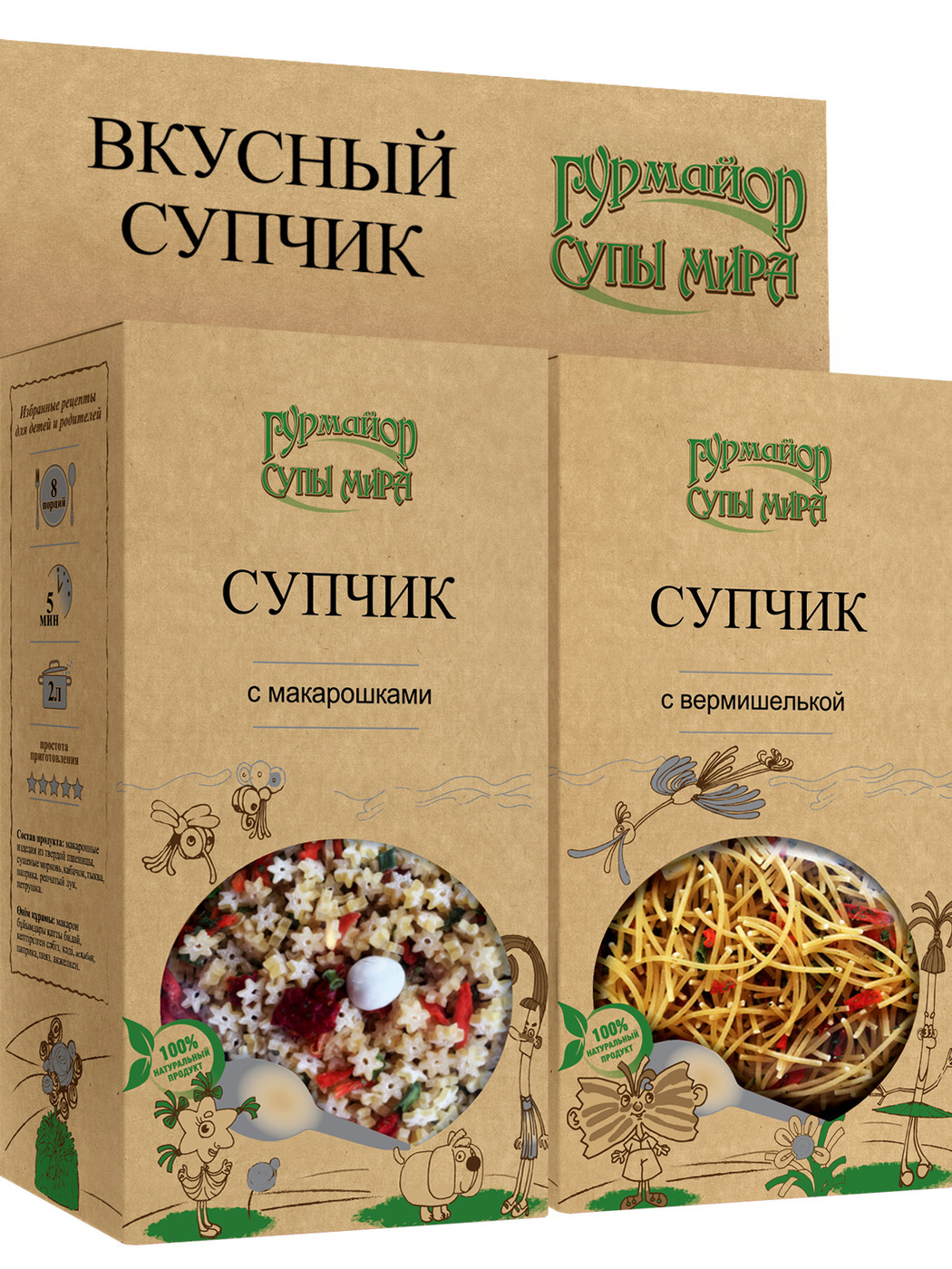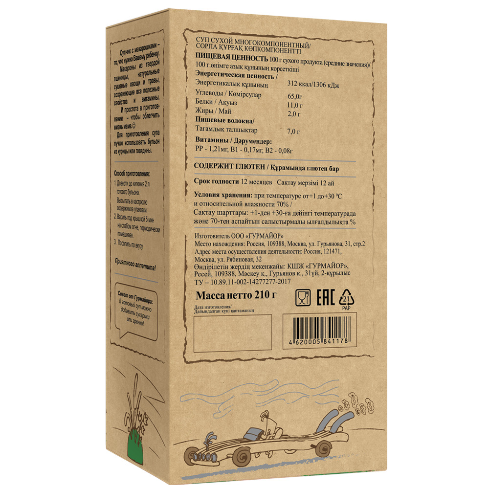 Описание: Набор супов для детей с вермишелью и макаронами - то, что нужно Вашему ребенку. Супы можно приготовить на воде, но лучше использовать бульон из свежей курицы или говядины. Очень просты в приготовлении - всего 5 минуты и супчик можно подавать к столу. Каждая упаковка рассчитана на 8 полноценных порций. В составе Супов только натуральные овощи, и травы: сублимированный горох и кукуруза, морковь, кабачок, паприка, зеленый лук, петрушка. И конечно же макаронные изделия из твердой пшеницы с высоким содержанием растительного белка, клетчатки, микроэлементов и витаминов группы "В".