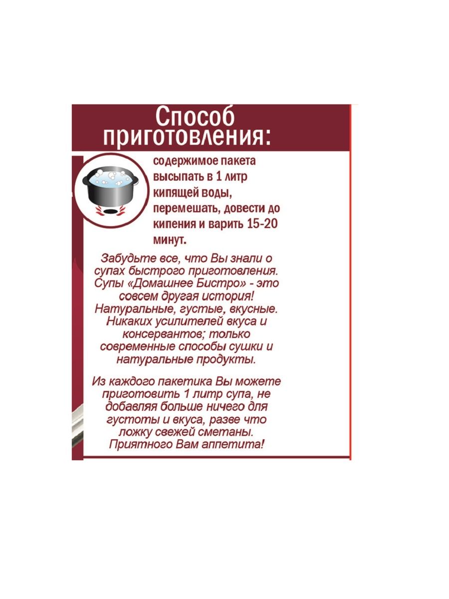 Описание: Продукт высочайшего качества, позволяющий за 15-20 минут сварить суп, не уступающий домашним рецептам.
