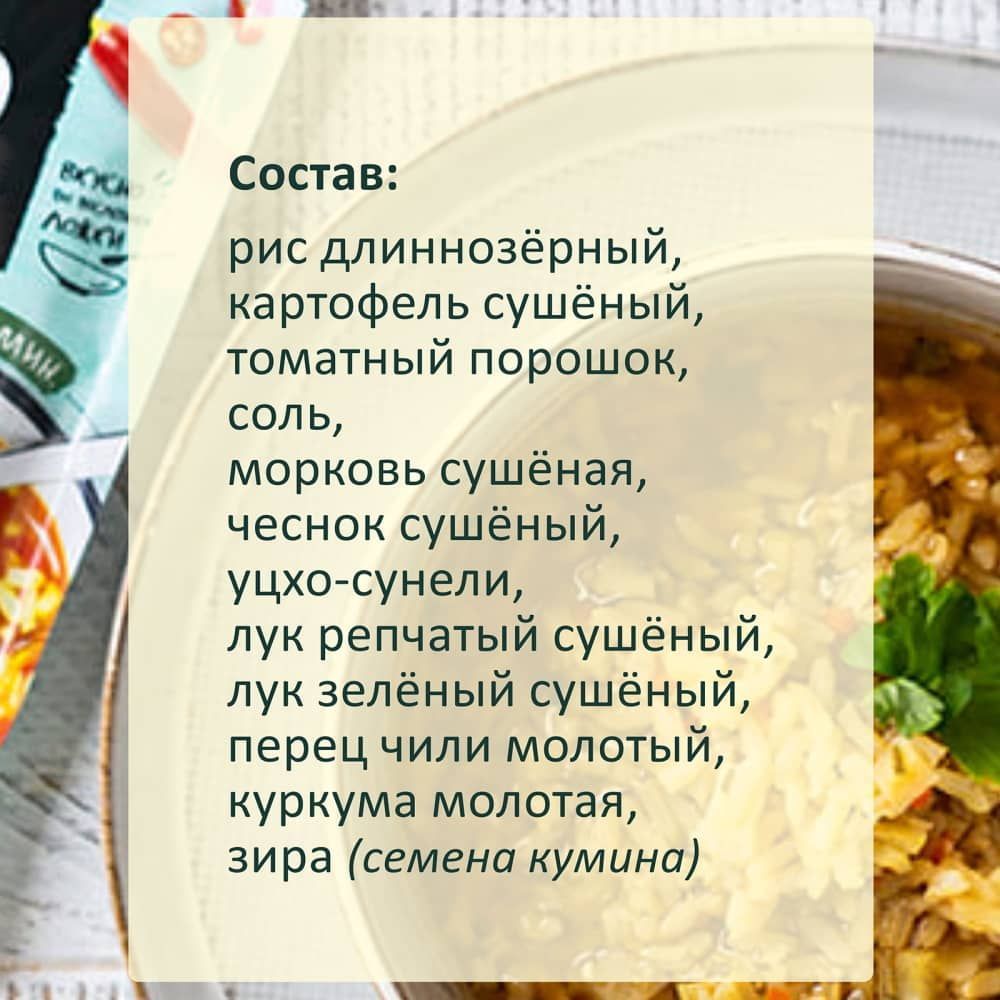 Рис длиннозерный, картофель кубик сушёный, томаты молотые сушёные (томатная паста сушёная, томатный порошок сушёный), соль поваренная пищевая, морковь сушёная, чеснок сушёный гранулированный, лук сушёный, лук зелёный сушёный, перец молотый красный (перец чили), куркума, кумин.