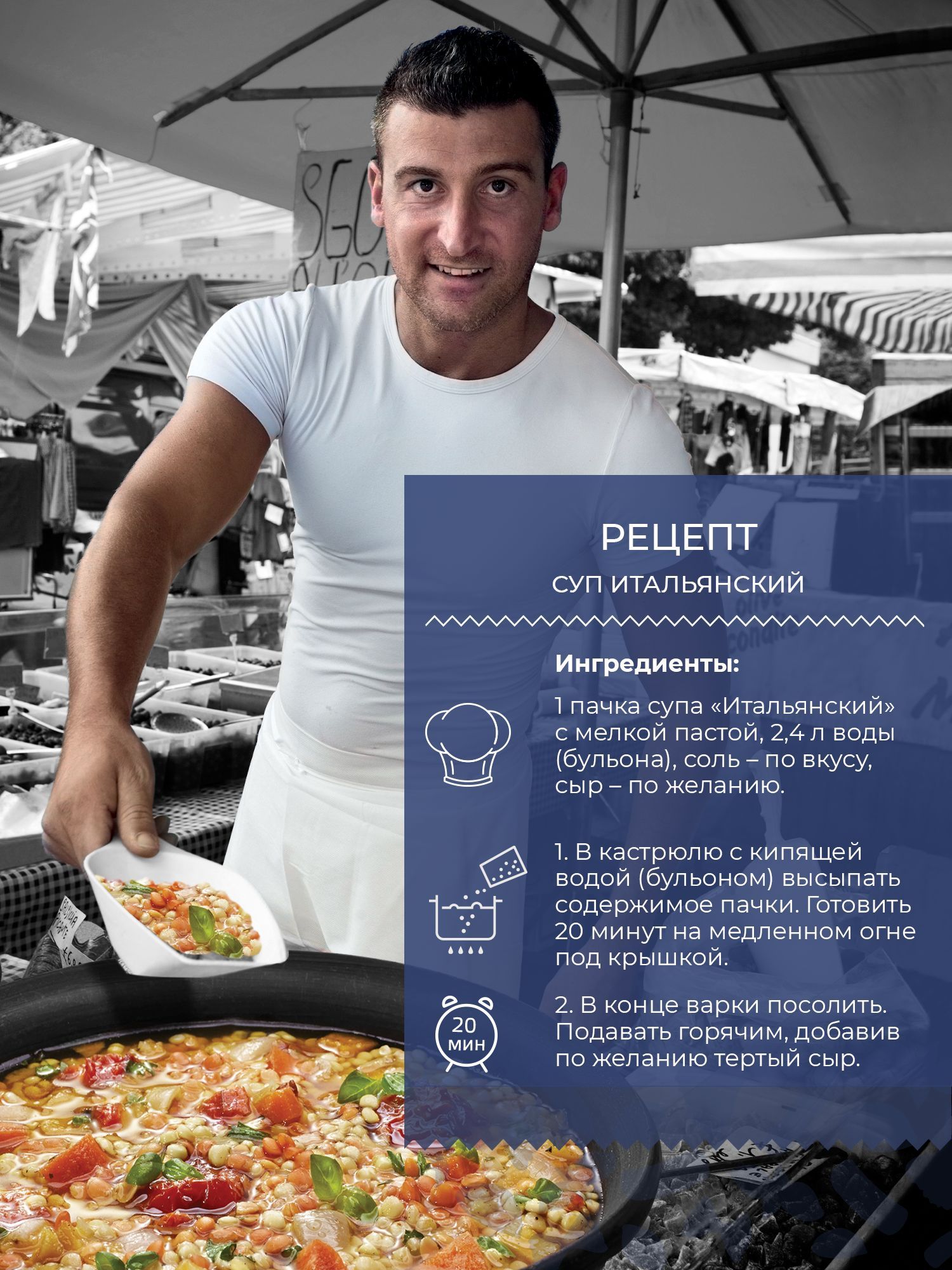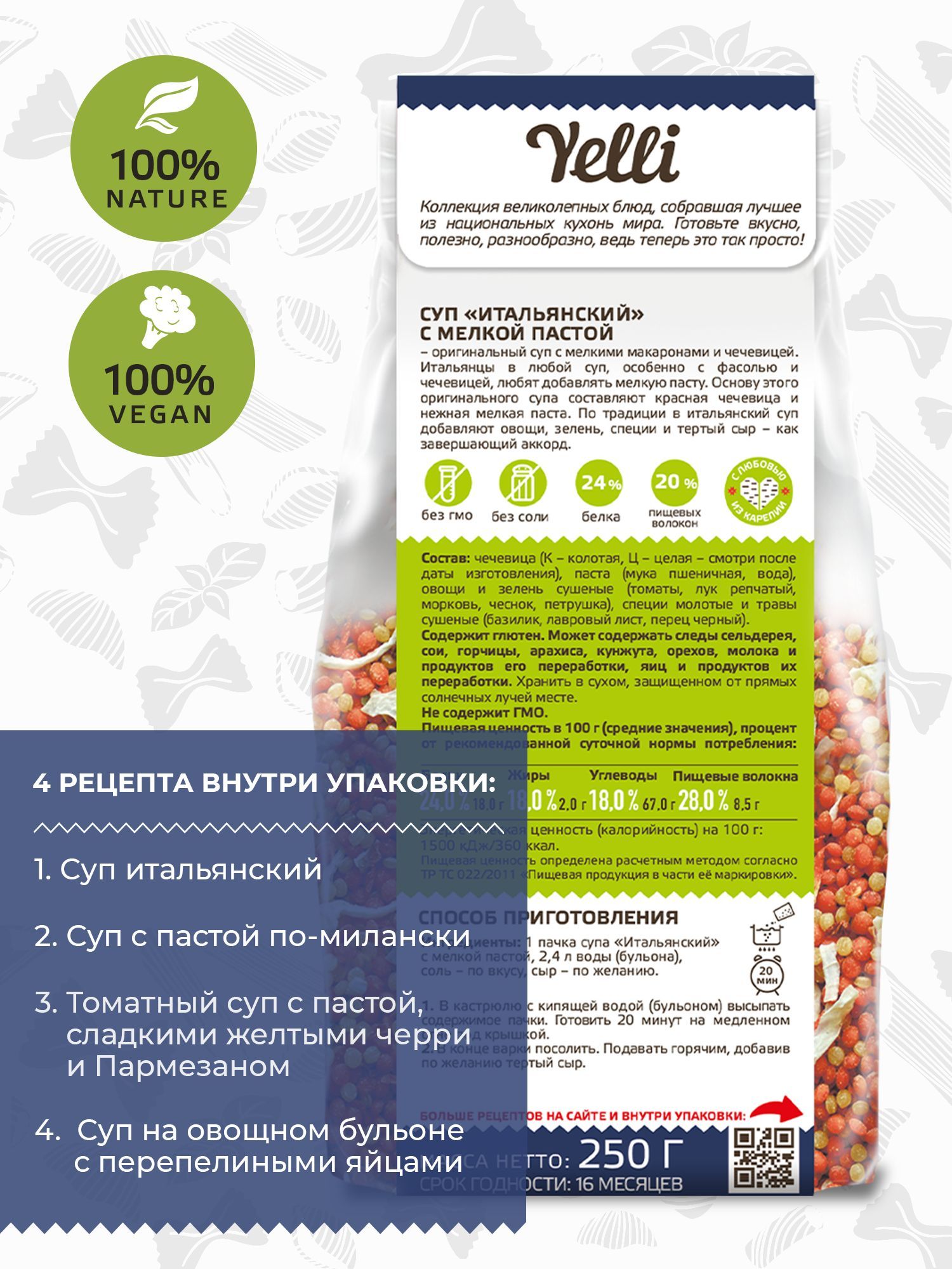 Бренд Yelli предлагает уже готовую основу для быстрого приготовления этого вкусного супа, поэтому вам не придется тратить время на подготовку продуктов. Всего за 20 минут вы получите большую кастрюлю супа для полноценного обеда. В 2,4 л кипящей воды или бульона нужно высыпать смесь, готовить 20 минут на медленном огне под крышкой, в конце варки посолить по вкусу. По итальянской традиции рекомендуем добавить в конце приготовления тертый сыр, чтобы дополнить и подчеркнуть вкус. Это комплексный продукт, который можно приготовить на домашней или дачной кухне в кастрюле или суповарке, а также на огне в туристическом походе. Сбалансированная смесь на 100% натуральная, не содержит ГМО и соль. Продукт подойдет людям, которые придерживаются здорового правильного питания, для вегетарианского, веганского, постного меню. В набор для приготовления супа входят богатая белками красная чечевица, нежная мелкая паста Птитим, сушеные томаты, репчатый лук, морковь, чеснок, петрушка, молотый базилик и лавровый лист, острый и пряный черный перец. Упаковка Итальянского супа – отличный подарочный вариант для любого человека, который хочет питаться вкусно, полезно и разнообразно.