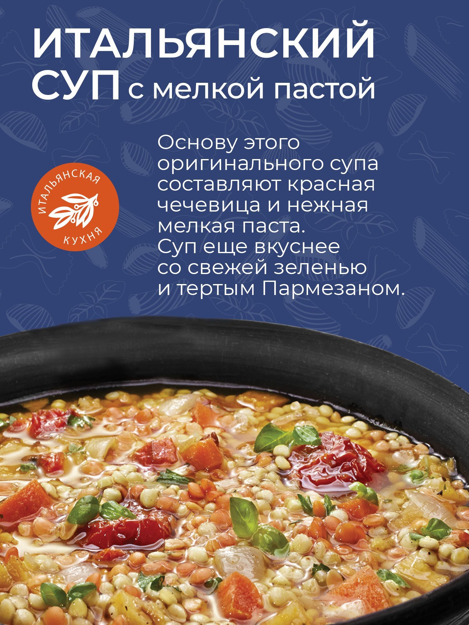 Описание: Итальянский суп – оригинальное первое блюдо, основу которого составляют красная чечевица и нежная мелкая паста. Итальянцы в любой суп, особенно с фасолью или чечевицей, любят добавлять мелкую пасту. По традиции в итальянский суп добавляют овощи, зелень, специи и тертый сыр в качестве завершающего аккорда.