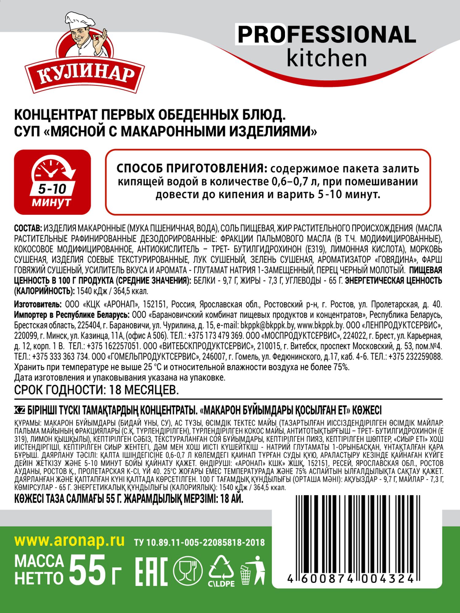 изделия макаронные (мука пшеничная, вода), соль пищевая, жир растительного происхождения (масла растительные рафинированные дезодорированные: фракции пальмового масла (в т.ч. модифицированные) кокосовое модифицированное, антиокислитель – трет-бутилгидрохинон (E319), лимонная кислота), морковь сушеная, изделия соевые текстурированные, лук сушеный, зелень сушеная, ароматизатор “говядина”, фарш говяжий сушеный, усилитель вкуса и аромата глутамат натрия 1 – замещенный, перец молотый