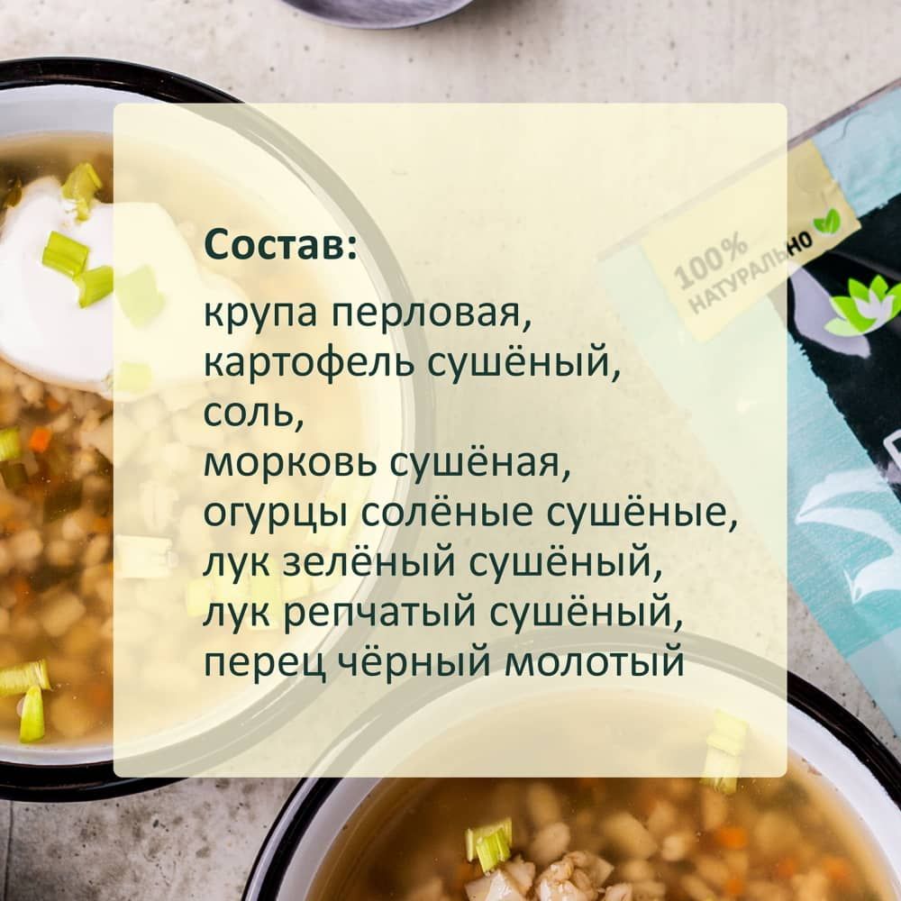 Крупа перловая, картофель кубик сушёный, соль поваренная пищевая, морковь сушёная, огурцы солёные сушёные резанные, лук зелёный сушёный, лук сушёный, перец чёрный молотый.