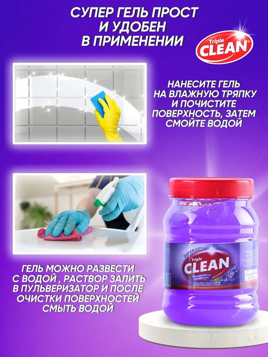 Описание: Универсальный чистящий гель Triple clean c запахом лаванда— это эффективное средство для поддержки чистоты и гигиены во всем доме. Антибактериальный гель способствует уничтожению плесени, грибков и бактерий и может использоваться для очищения различных поверхностей в ванной, туалете, на кухне. Triple clean гель применяется для обработки кафеля, плиты, кухонных столешниц, отбеливания белья. Густая гелевая текстура помогает экономно расходовать средство и верно отмерять его дозировку. Гель Triple clean быстро высыхает после обработки поверхностей. Универсальный чистящий гель Triple clean:-обеспечивает чистоту и гигиену во всем доме;-является универсальным средством;-уничтожает бактерии, грибки и плесень;-быстро высыхает;-выпускается в виде экономичного геля.