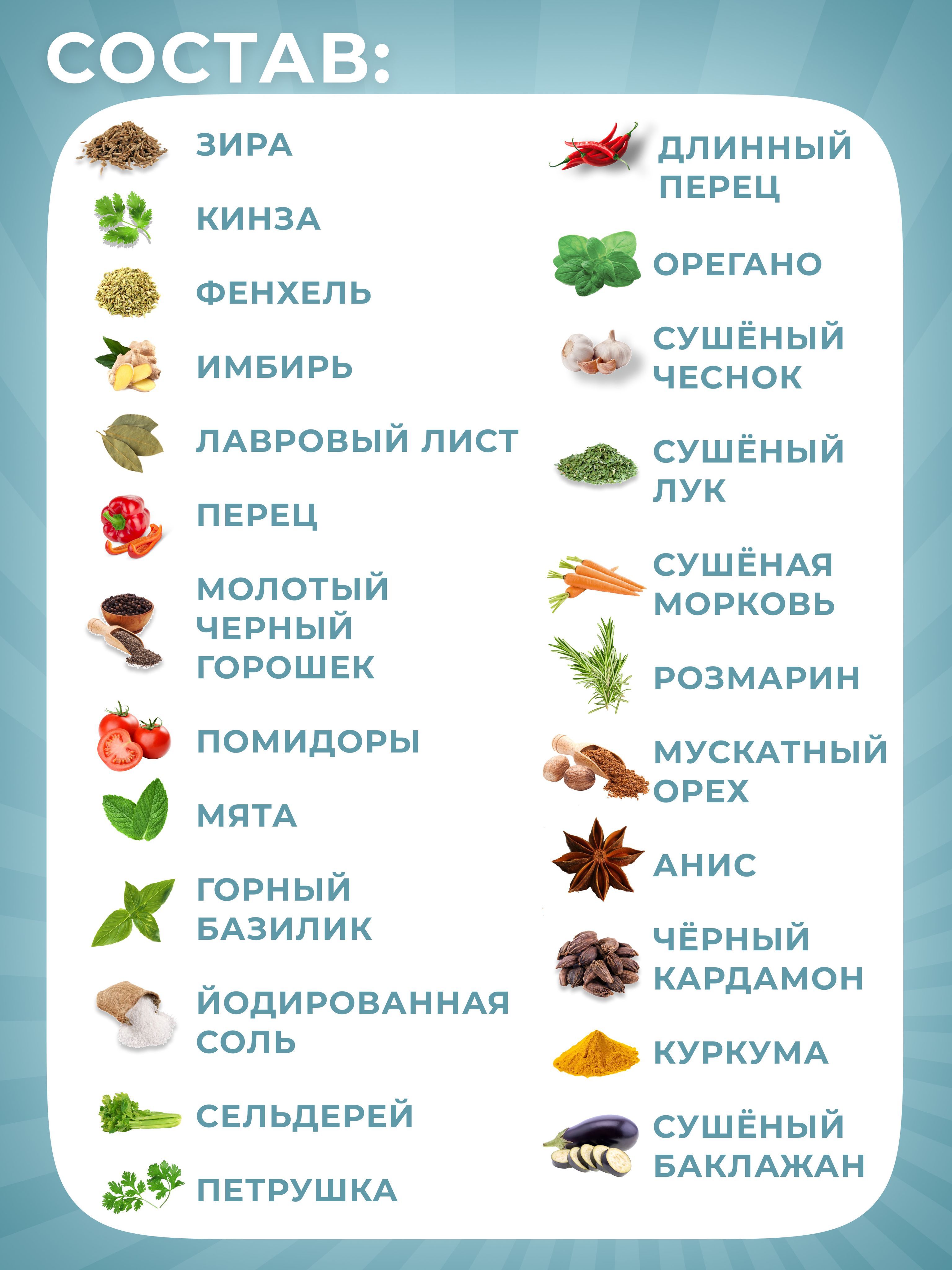 ЗИРА КИНЗА ФЕНХЕЛЬ ИМБИРЬ ЛАВРОВЫЙ ЛИСТ ПЕРЕЦ молотЫЙ ЧЕРНЫЙ ГОРОШЕК ПОМИДОРЫ МЯТА ГОРНЫЙ БАЗИЛИК ЙОДИРОВАННАЯ СОЛЬ СЕЛЬДЕРЕЙ ПЕТРУШКА ДЛИННЫЙ ПЕРЕЦ ОРЕГАНО СУШЁНЫЙ ЧЕСНОК СУШЁНЫЙ ЛУК СУШЁНАЯ МОРКОВЬ РОЗМАРИН МУСКАТНЫЙ ОРЕХ АНИС ЧЁРНЫЙ КАРДАМОН КУРКУМА СУШЁНЫЙ БАКЛАЖАН